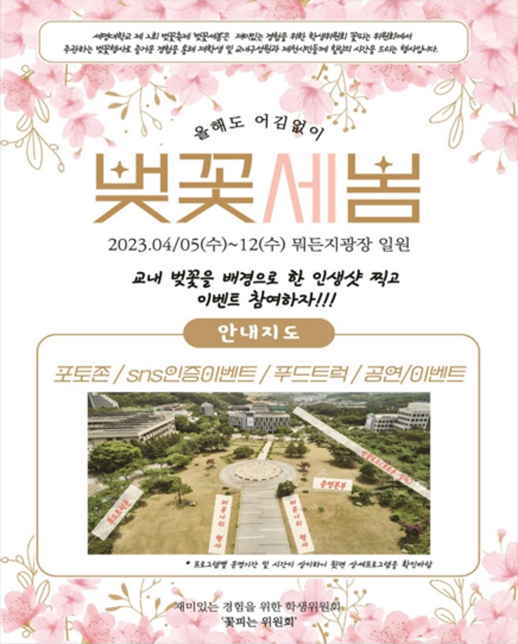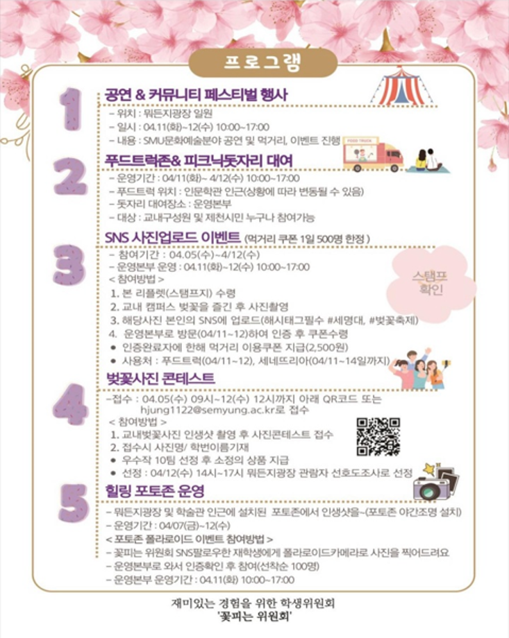 본문 시작 홈으로 커뮤니티 학과소개 교수소개 학과과정 커뮤니티 대학원 홈페이지가이드 포토갤러리 공지사항 채용정보 포토갤러리 Youtube 바로가기 Instargram 바로가기 Blog 바로가기 Facebook 바로가기 포토갤러리 페이스북 트위터 프린트 🌸 벚꽃세봄 🌸 뷰티케어학 2478 2023-04-04 일정 : 2023.04.05 (수) ~ 2023.04.12 (수) 장소 : 뭐든지 광장 일원 🌸 세명대학교가 제2회 벚꽃축제 “벚꽃세봄”은 재미있는 경험을 위한 학생위원회 ‘꽃피는 위원회’에서 주관하는 벚꽃 행사입니다! 재학생 및 교내 구성원과 제천시민 분들께 힐링을 드립니다 :) 🌸 벚꽃 사진 콘테스트, 포토존, 돗자리 대여, 즐거운 공연까지! 다양한 행사와 즐거움이 가득한 행사를 즐겨보세요😆 목록 다음 세명대학교 등록금 환불제 다음 🎊세명대학교 제 30회 청룡축전🎊
