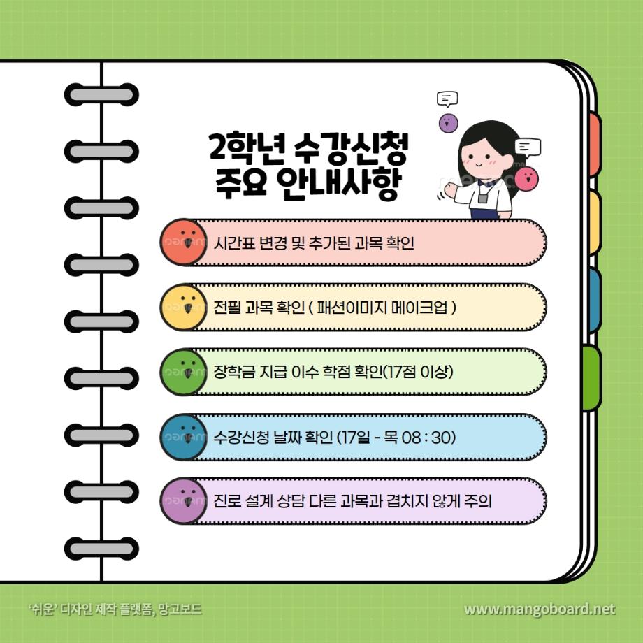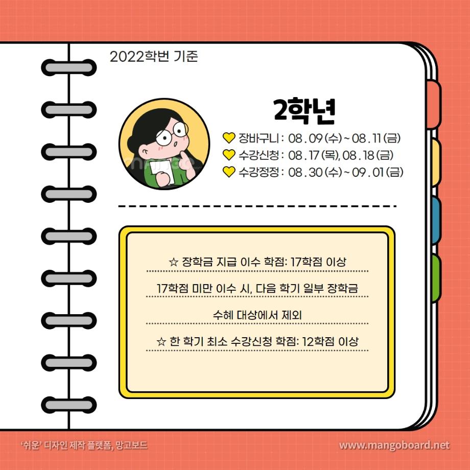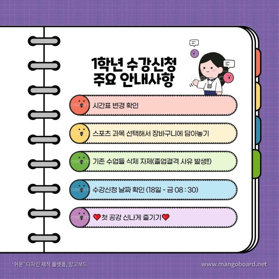 본문 시작 홈으로 커뮤니티 학과소개 교수소개 학과과정 커뮤니티 대학원 홈페이지가이드 포토갤러리 공지사항 채용정보 포토갤러리 Youtube 바로가기 Instargram 바로가기 Blog 바로가기 Facebook 바로가기 포토갤러리 페이스북 트위터 프린트 🌻2023년도 2학기 수강신청 안내 🌻 뷰티케어학 2727 2023-08-09 - 08. 09 ~ 08. 11 [장바구니] - 08. 17 ( 08 : 30 ) [2학년 수강신청] - 08. 18 ( 08 : 30)) [1학년 수강신청] 8월 18일은 모든 학년이 수강신청 가능합니다. 여러분 즐거운 방학 보내고 계신가요~? 수강신청이 얼마 남지 않은 지금 ! 이 내용 꼭 참고하셔서 좋은 결과 있길 바라겠습니다 💖 따로 궁금한 점이 있으시면 편하게 댓글 남겨주세요 ! 목록 이전원주 MBC 아카데미 뷰티스쿨 입시설명회 이전2023 세:티져 프로젝트 숏폼 콘텐츠 공모전