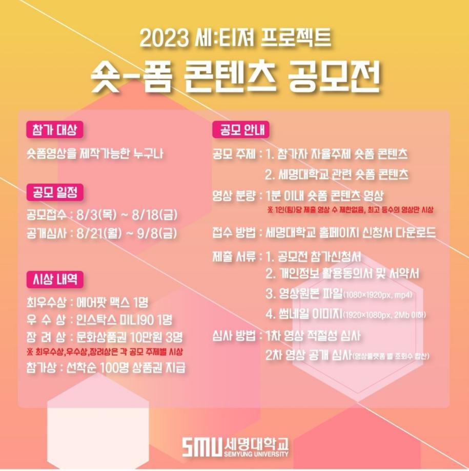 본문 시작 홈으로 커뮤니티 학과소개 교수소개 학과과정 커뮤니티 대학원 홈페이지가이드 포토갤러리 공지사항 채용정보 포토갤러리 Youtube 바로가기 Instargram 바로가기 Blog 바로가기 Facebook 바로가기 포토갤러리 페이스북 트위터 프린트 2023 세:티져 프로젝트 숏폼 콘텐츠 공모전 뷰티케어학 2643 2023-08-03 2023 세:티져 프로젝트 숏폼 콘텐츠 공모전 숏폼영상을 만들 수 있는 누구나 참여가능!! 세명대학교와 관련한 주제 또는 일상에서의 자율주제로 영상을 제작하여 공모전에 참여하고, 에어팟맥스, 인스탁스, 문화상품권 등 다양한 상품을 받아가 보세요~ 목록 다음 🌻2023년도 2학기 수강신청 안내 🌻 다음 청주 더한 뷰티 미용학원 입시설명회