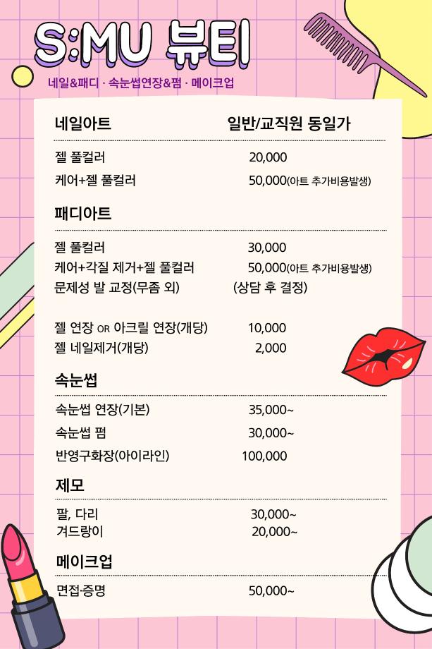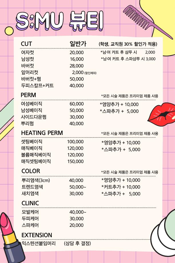 본문 시작 홈으로 커뮤니티 학과소개 교수소개 학과과정 커뮤니티 대학원 홈페이지가이드 포토갤러리 공지사항 채용정보 포토갤러리 Youtube 바로가기 Instargram 바로가기 Blog 바로가기 Facebook 바로가기 포토갤러리 페이스북 트위터 프린트 세명대학교 S:MU 뷰티 살롱 OPEN 뷰티케어학 2968 2023-09-01 1. 오픈일 : 2023년 9월 1일 2. 이용안내 : 전화 or 네이버 예약 3. 할인 : 세명대학교 교직원 인증 시 할인 된 가격으로 이용하실 수 있습니다 4. 위치 : 뷰티케어센터 2층 5. 관련문의 : 043-649-7368 목록 이전재학생 모교방문단: 정신여자고등학교 다음 2023년도 2학기 개강총회