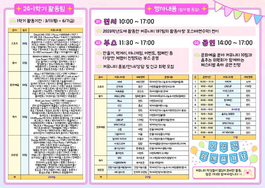 본문 시작 홈으로 커뮤니티 학과소개 교수소개 학과과정 커뮤니티 대학원 홈페이지가이드 포토갤러리 공지사항 채용정보 포토갤러리 Youtube 바로가기 Instargram 바로가기 Blog 바로가기 Facebook 바로가기 포토갤러리 페이스북 트위터 프린트 커뮤니티 페스티벌✨ 뷰티케어학 1829 2024-04-01 커뮤니티 페스티벌 4월 2~3일 봄을 맞아 새로운 행사가 열립니다! 여러 부스 활동들과 먹거리, 공연등이 펼쳐지니 많은 관심과 참여 부탁드립니다:) 전시,부스 종류와 공연시간등을 잘 참고하셔서 즐기시길 바래요✨ 전시-10:00~17:00 부스-11:30~17:00 공연-14:00~16:00 📍뭐든지 광장 (위치는 지도 참고) 목록 이전💫모듈형 교육과정 뷰티영양학 토론수업💫 다음 벚꽃세봄✨