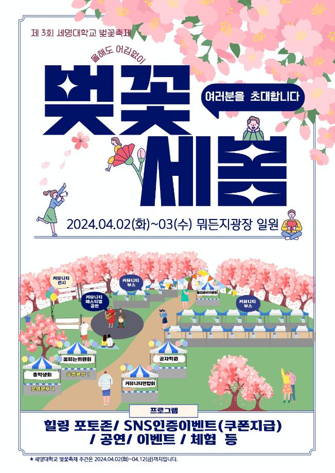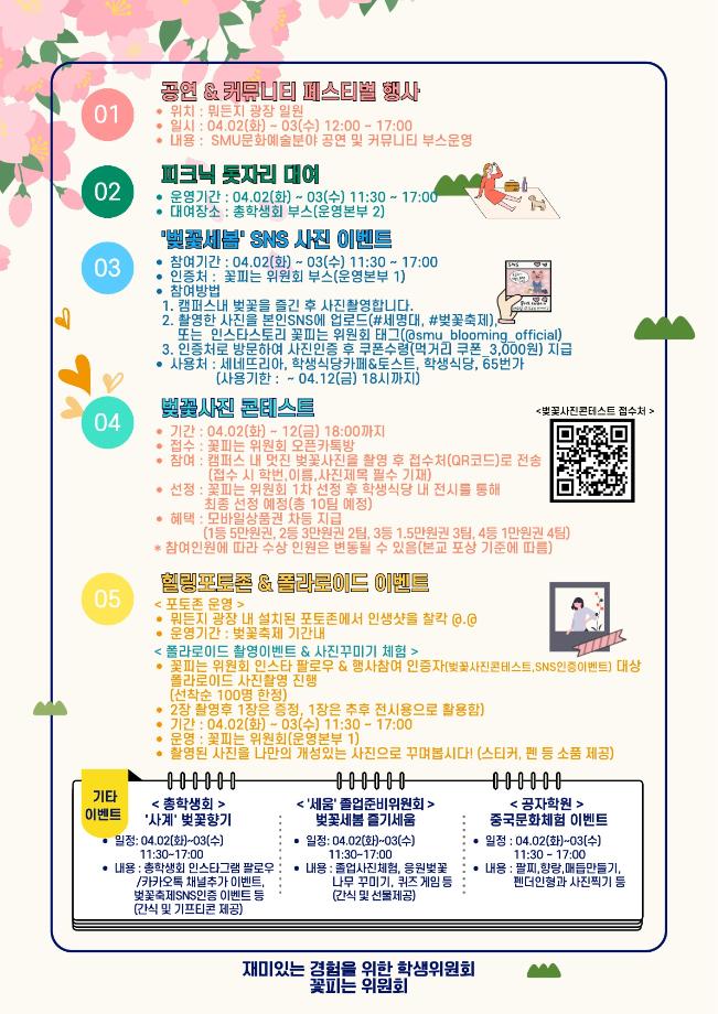 본문 시작 홈으로 커뮤니티 학과소개 교수소개 학과과정 커뮤니티 대학원 홈페이지가이드 포토갤러리 공지사항 채용정보 포토갤러리 Youtube 바로가기 Instargram 바로가기 Blog 바로가기 Facebook 바로가기 포토갤러리 페이스북 트위터 프린트 벚꽃세봄✨ 뷰티케어학 2013 2024-04-01 4월 2~3일, 봄을 맞아 새로운 행사가 열립니다! 여러 부스 활동들과 먹거리, 공연등이 펼쳐지니 많은 관심과 참여 부탁드립니다🩷 전시,부스 종류와 공연시간등을 잘 참고하셔서 즐기시길 바래요✨ 전시-10:00~17:00 부스-11:30~17:00 공연-14:00~16:00 📍뭐든지 광장 (위치는 지도 참고) 목록 이전커뮤니티 페스티벌✨ 다음 세명진로 festival 도전 특강: ‘레드오션에서 브랜드로 성공하는 마케팅’