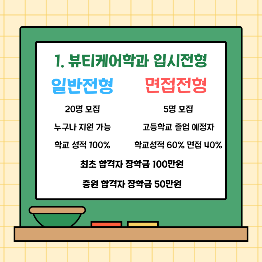 본문 시작 홈으로 커뮤니티 학과소개 교수소개 학과과정 커뮤니티 대학원 홈페이지가이드 포토갤러리 공지사항 채용정보 포토갤러리 Youtube 바로가기 Instargram 바로가기 Blog 바로가기 Facebook 바로가기 포토갤러리 페이스북 트위터 프린트 2025학년도 신입생 수시 입시 모집요강 뷰티케어학과 2137 2024-06-11 벌써 한 해의 절반 이상이 지나갔네요! 올해 입학한 24 학번 새내기 분들이 이제 새내기 티를 벗어내고 내년 2025년도에 있을 새로운 신입생 분들을 마주 할 시간도 별로 남지 않았어요:) 2025에 새로 들어올 예비 신입생 분들을 위해 세명대학교 뷰티케어학과의 수시 모집요강에 관하여 간략하게 알아보도록 할게요 목록 이전뷰티케어학과 2024년도 SMU연계프로그램 다음 뷰티케어학과 청주SBS뷰티아카데미 입시설명회