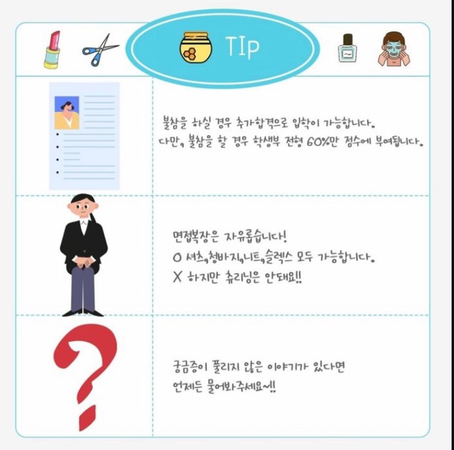 본문 시작 홈으로 커뮤니티 학과소개 교수소개 학과과정 커뮤니티 대학원 홈페이지가이드 포토갤러리 공지사항 채용정보 포토갤러리 Youtube 바로가기 Instargram 바로가기 Blog 바로가기 Facebook 바로가기 포토갤러리 페이스북 트위터 프린트 📣 세명대학교 “뷰티케어학과” 면접일은 2024.10.11(금)입니다! 바이오코스메틱학과 2006 2024-10-08 📣 세명대학교 “뷰티케어학과” 면접일은 2024.10.11(금)입니다! 1부-pm.1시/2부-pm.3시30분 총 두 타임으로 나눠서 진행될예정입니다! 면접 예상질문은 2024.10.7(월) 이전에 공지될 예정이니 자세한 내용은 세명대학교 홈페이지를 확인해주세요!! 목록 이전헤어기초커트1 다음 제5회 청주시장배 미용기술경연대회 금상,은상!