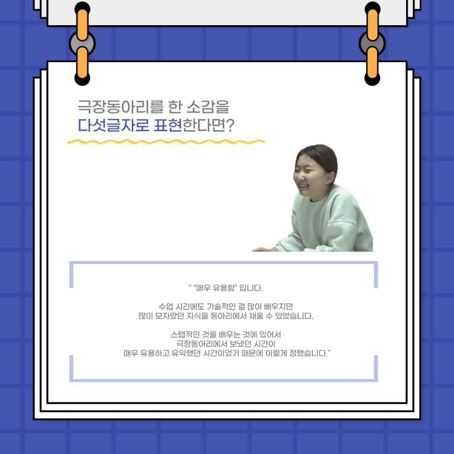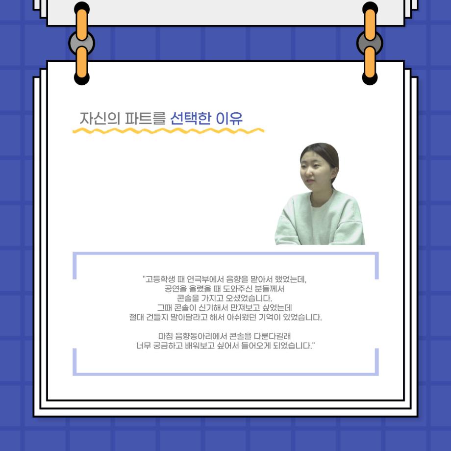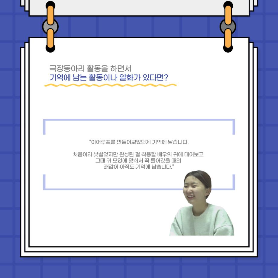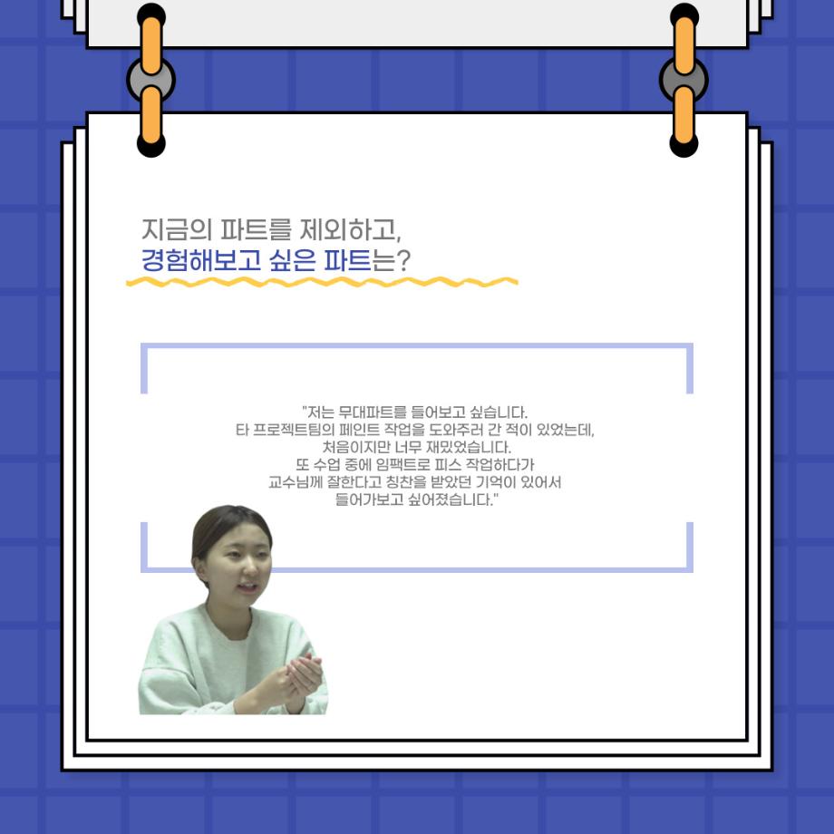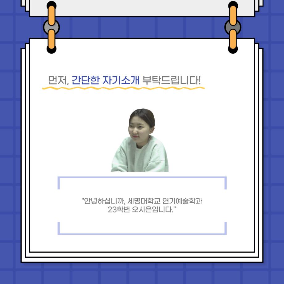 본문 시작 홈으로 커뮤니티 학과소개 입학정보 교수소개 학과과정 커뮤니티 공연예매 안내 홈페이지가이드 포토갤러리 공지사항 포토갤러리 작품DB 동아리 학사일정 학생회 포토갤러리 페이스북 트위터 프린트 사이와의 인터뷰 - 23년도 극장동아리 음향 파트 부원 ‘오시은‘ 연기예술학과 2821 2024-01-19 안녕하십니까. 23년도 학회 ‘사이’입니다. 학회 ‘사이’의 열다섯번째 인터뷰로 연기예술학과 23년도 극장동아리 음향 파트 부원인 오시은 학생과 인터뷰하는 시간을 가졌습니다. 이번 인터뷰에서는 음향파트를 선택한 이유, 극장동아리를 통해 배운 것, 동아리를 하면서 기억에 남는 활동이나 일화 등에 대해 인터뷰하였습니다. 다음 인터뷰 컨텐츠 ‘사인’도 많은 사랑 부탁드립니다. 목록 이전제102회 세명대학교 연기예술학과 정기공연 1학년 <에쮸드 발표회> 공연 성료 다음 찾아가는 충북 도립극단 설명회 담당부서 : 연기예술학과 담당자 : - 연락처 : 043-649-1733 최종수정일 : 2024-10-26 만족도조사 만족도 조사 이 페이지에서 제공하는 정보에 대하여 만족하시나요? 매우만족 만족 보통 불만족 매우불만족