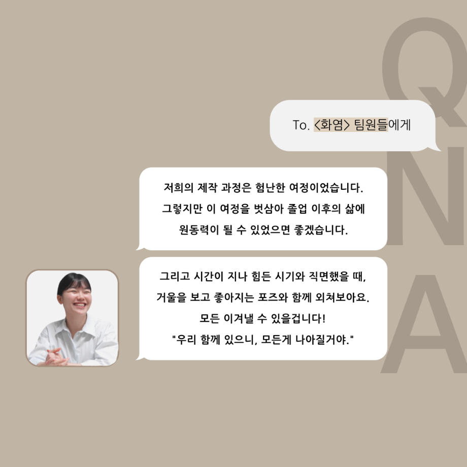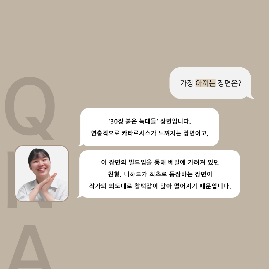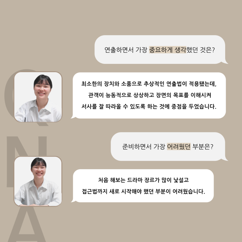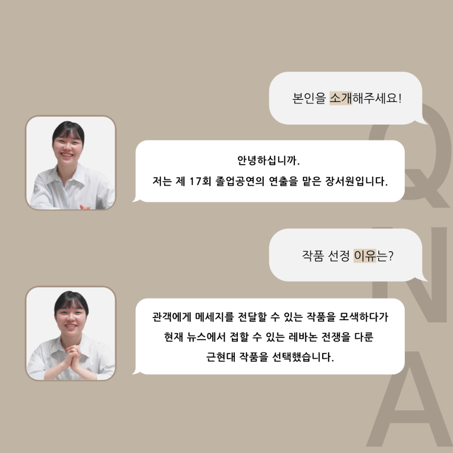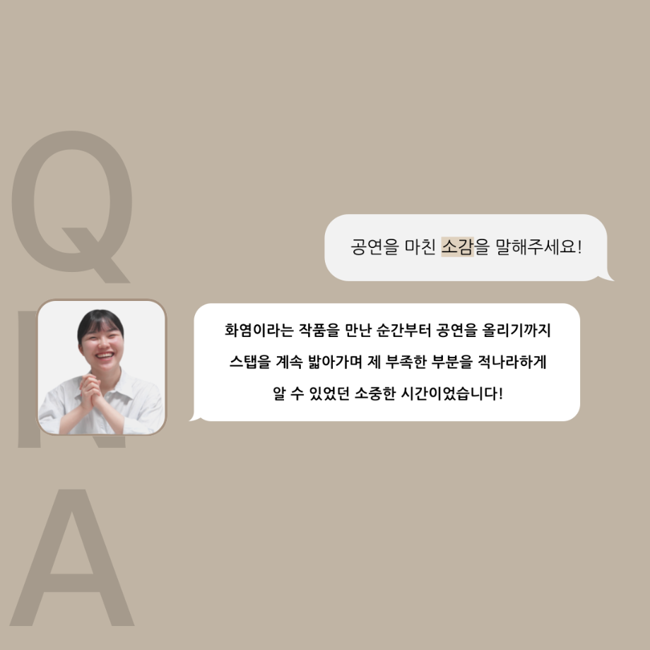 본문 시작 홈으로 커뮤니티 학과소개 입학정보 교수소개 학과과정 커뮤니티 공연예매 안내 홈페이지가이드 포토갤러리 공지사항 포토갤러리 작품DB 동아리 학사일정 학생회 포토갤러리 페이스북 트위터 프린트 ‘품’위있는 인‘터뷰’ - 24년도 졸업작품 학생 연출 <장서원> 연기예술학과 3013 2024-12-04 안녕하십니까. 24년도 학회 ‘품’ 입니다. 학회 ‘품’의 열 여섯 번째 인터뷰로 세명대학교 연기예술학과 제 17회 졸업작품 <화염>의 학생 연출 장서원 학우와 인터뷰 하는 시간을 가졌습니다. 작품 선정 이유부터 아끼는 장면, 연출하면서 가장 중요하게 생각했던 장면과 작품을 준비하면서 어려웠던 부분에 대해 알 수 있는 시간을 가졌습니다. 앞으로 있을 인터뷰 컨텐츠인 ‘품터뷰’ 많은 사랑 부탁드립니다. 목록 이전제 111회 세명대학교 연기예술학과 뮤지컬제작실습 <All Shook Up> 스케줄표 다음 [24학번 1학년 대상] 비전 프로젝트 경험 교육_비전 포트폴리오 작성 안내 담당부서 : 연기예술학과 담당자 : - 연락처 : 043-649-1733 최종수정일 : 2024-10-26 만족도조사 만족도 조사 이 페이지에서 제공하는 정보에 대하여 만족하시나요? 매우만족 만족 보통 불만족 매우불만족