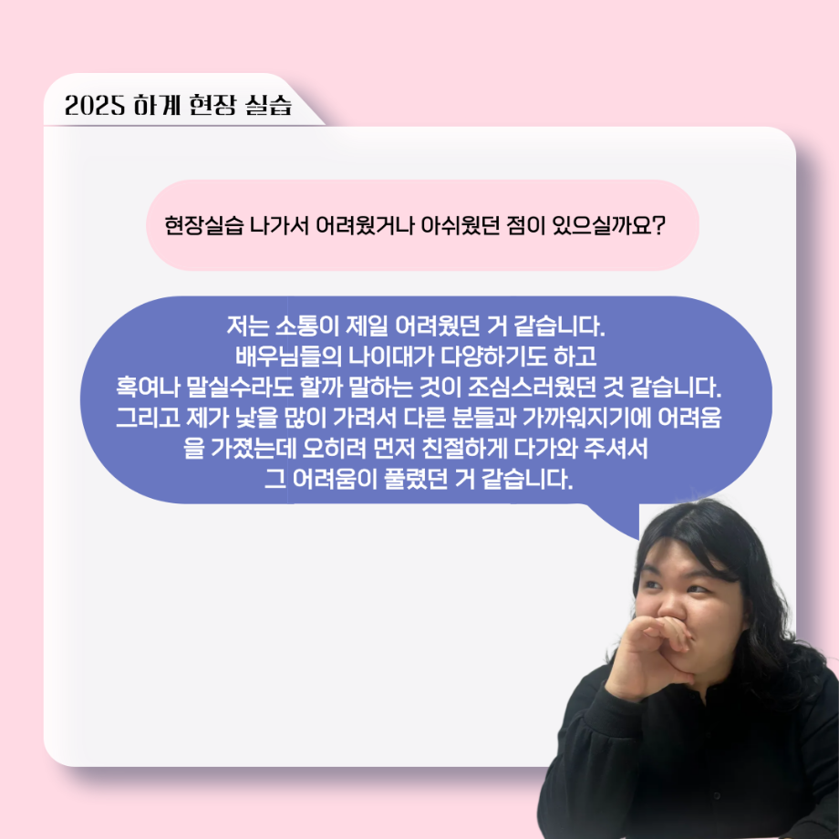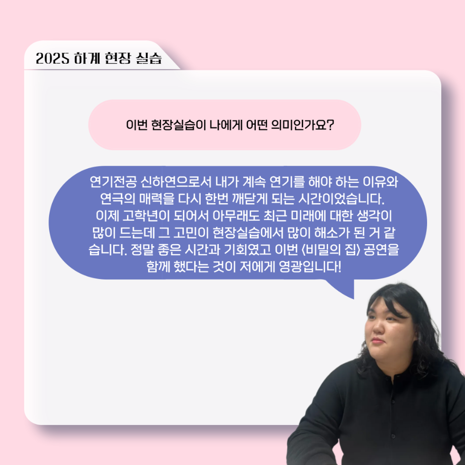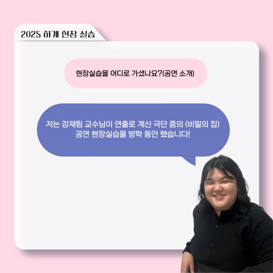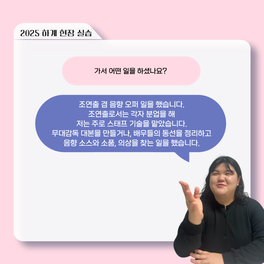 본문 시작 홈으로 커뮤니티 학과소개 입학정보 교수소개 학과과정 커뮤니티 공연예매 안내 홈페이지가이드 포토갤러리 공지사항 포토갤러리 작품DB 동아리 학사일정 학생회 포토갤러리 페이스북 트위터 프린트 ‘늘‘ 궁금한 이야기 - 현장실습 < 신하연 > 연기예술학과 959 2025-10-16 . 목록 이전117회 세명대학교 연기예술학과 하계프로젝트 사랑의 온도 배우 소개 다음 ‘늘‘ 궁금한 이야기 - 하계 프로젝트 ‘컨택’팀 고진役 < 조진석 > 담당부서 : 연기예술학과 담당자 : - 연락처 : 043-649-1733 최종수정일 : 2024-10-26 만족도조사 만족도 조사 이 페이지에서 제공하는 정보에 대하여 만족하시나요? 매우만족 만족 보통 불만족 매우불만족