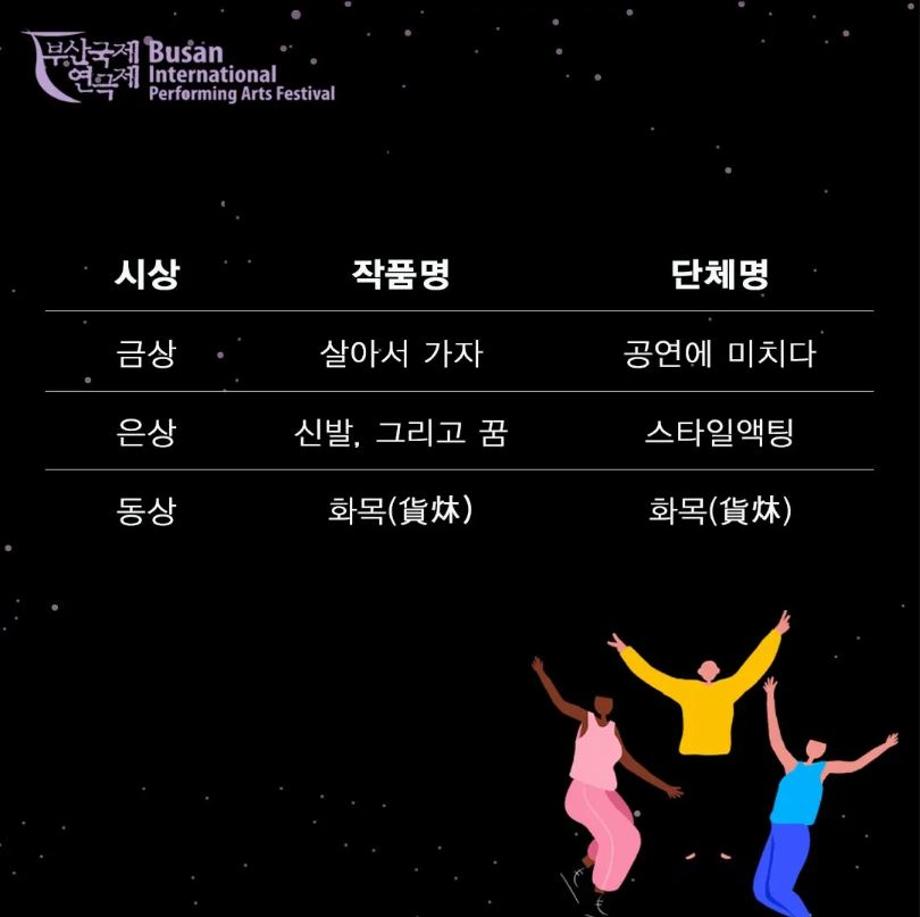 본문 시작 홈으로 커뮤니티 학과소개 입학정보 교수소개 학과과정 커뮤니티 공연예매 안내 홈페이지가이드 포토갤러리 공지사항 포토갤러리 작품DB 동아리 학사일정 학생회 포토갤러리 페이스북 트위터 프린트 🏆2022년 제19회 부산국제연극제 청년연극제 금상수상🏆 연기예술학과 2829 2022-06-22 🏆2022년 제19회 부산국제연극제 청년연극제 금상수상🏆 🌺이번 청년연극제 참가작인 [살아서 가자]는 신입생들과 2학년 학생들이 액션신과 군무 등 함께 호흡을 맞춰 즐겁게 연습했던 작품으로 금상까지 수상하게 되었습니다👥🎉🎉 열심히 연습하고 노력한 '살아서 가자' 팀에게 박수를 보냅니다👏👏 또한 이번 청년연극제에서 수상 받을 수 있도록 유튜브도 찾아보고 응원해준 모든 사람들에게 감사드립니다! 🔥 축하드립니다 🔥 목록 이전🏫[커버 COVER] 2022 High School Musical 세명대학교 연기예술학과 2022 무용동아리 프로젝트 화란&ATTENTION🏫 이전제 82회 세명대학교 연기예술학과 정기공연 중급연기 | 발표 <팔레트> 스틸컷🎨📸 담당부서 : 연기예술학과 담당자 : - 연락처 : 043-649-1733 최종수정일 : 2024-10-26 만족도조사 만족도 조사 이 페이지에서 제공하는 정보에 대하여 만족하시나요? 매우만족 만족 보통 불만족 매우불만족