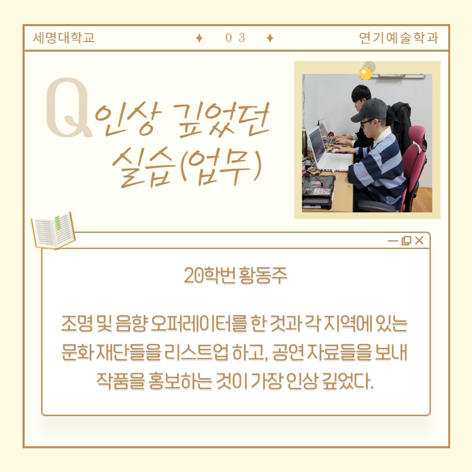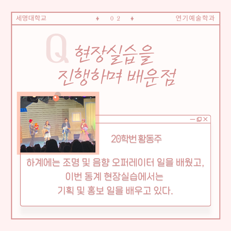 현장실습은 배우, 조명 및 음향, 기획 및 홍보, 프로덕션 제작, 연극 놀이 수업, 아동 교육 등 다양한 경험을 통해 학생들이 더욱 역량을 키워나갈 수 있는 기회를 제공합니다.🎷