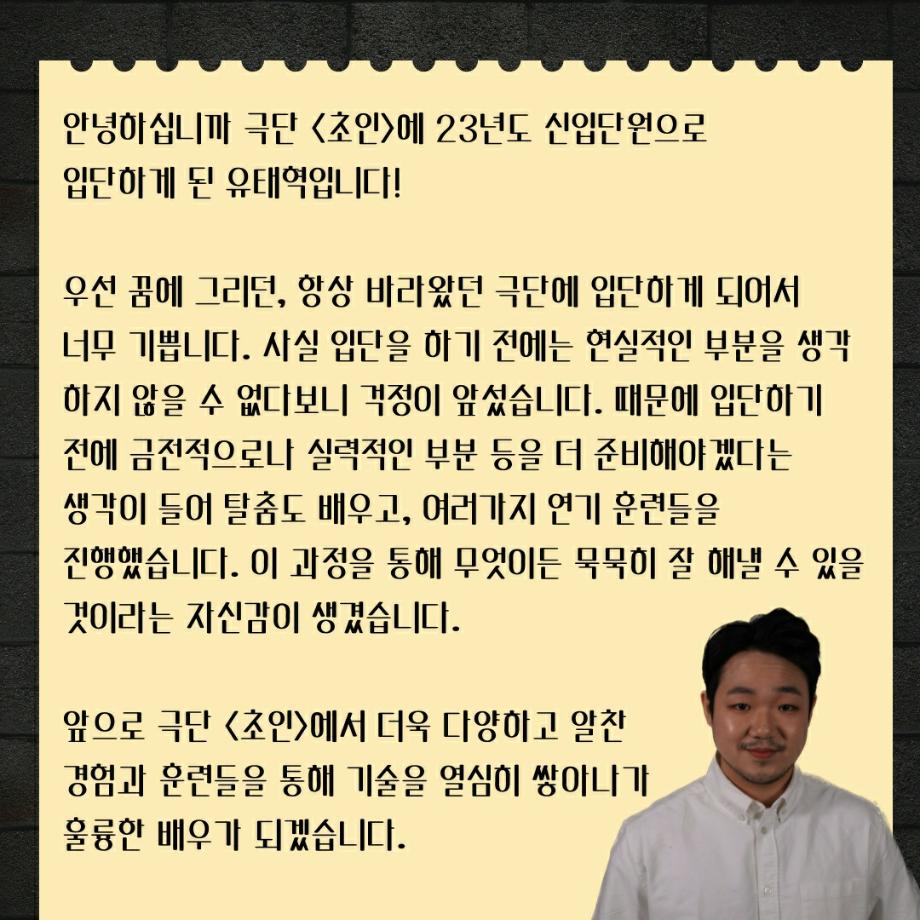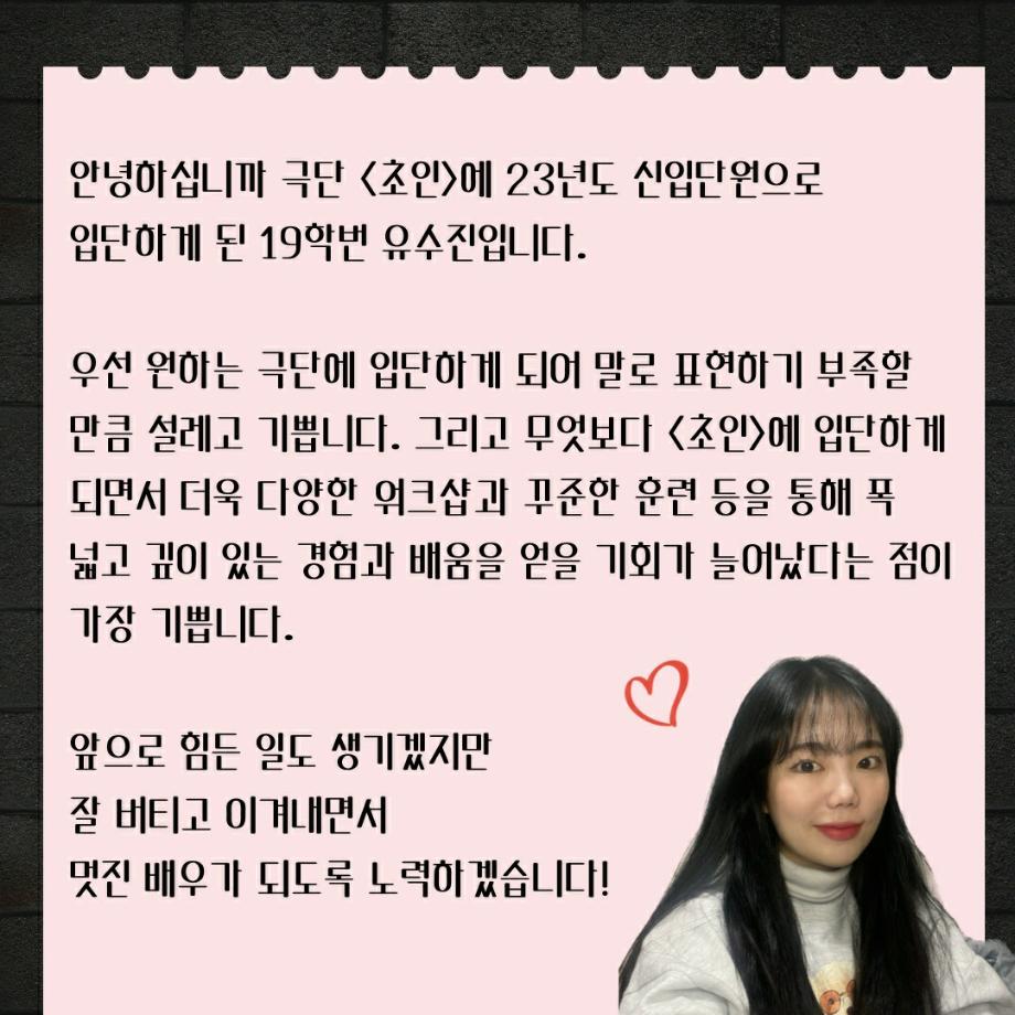 극단 <초인> - 17학번 유태혁, 19학번 유수진 신입단원 입단🎉