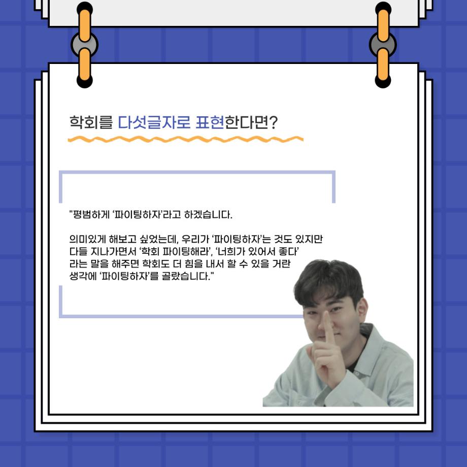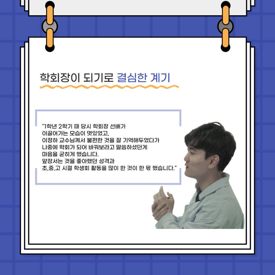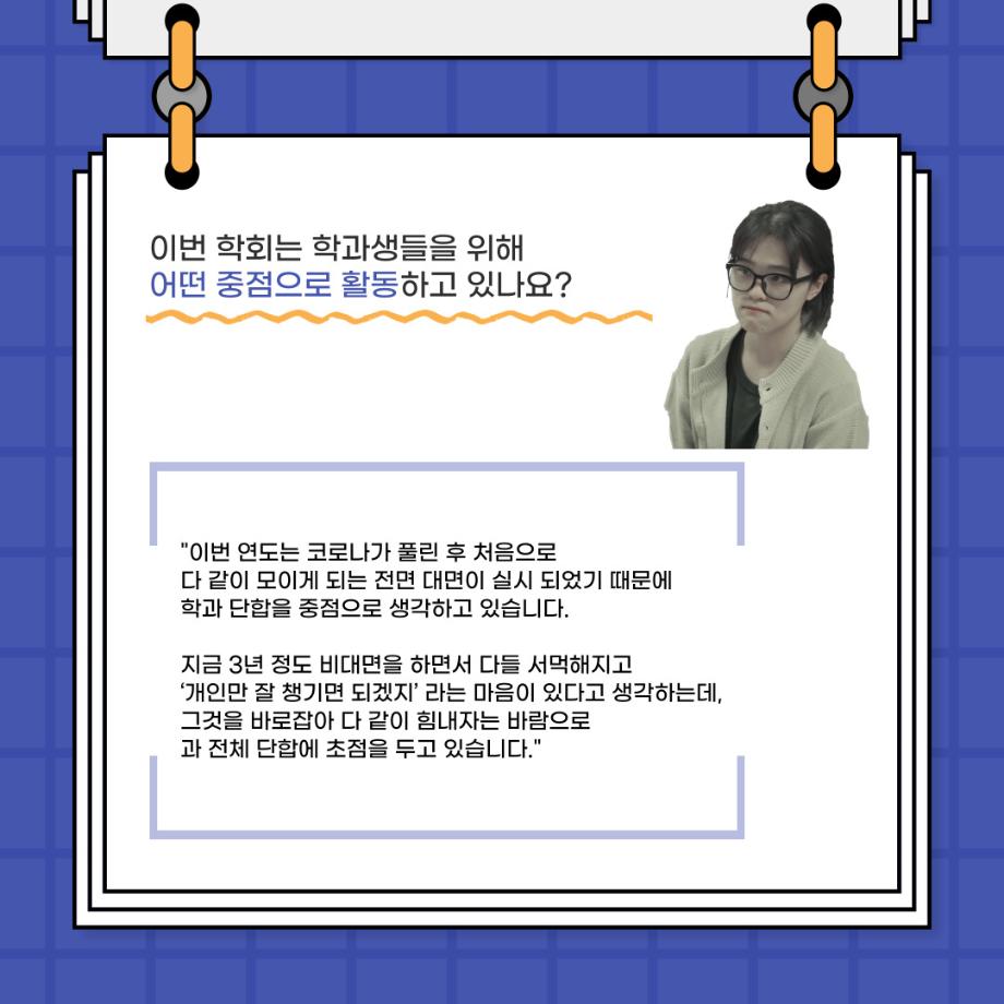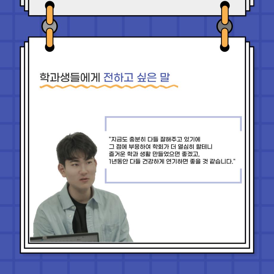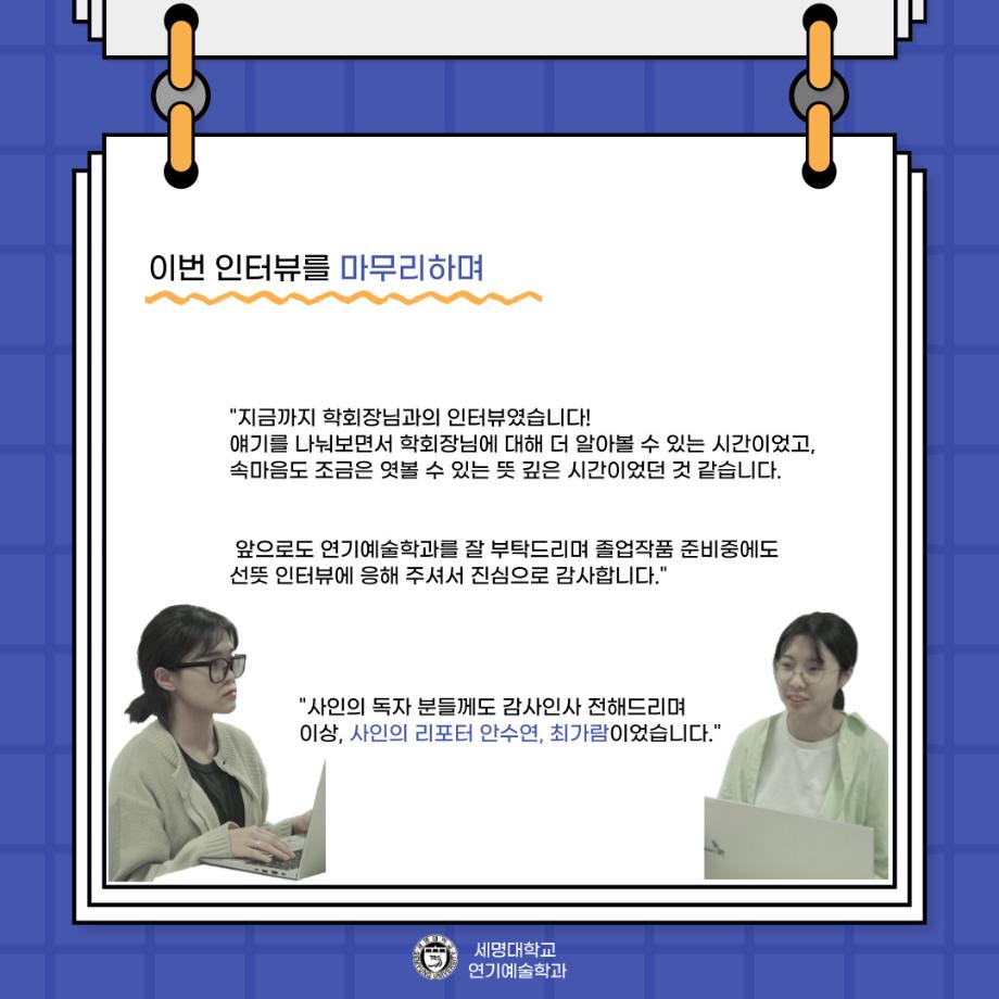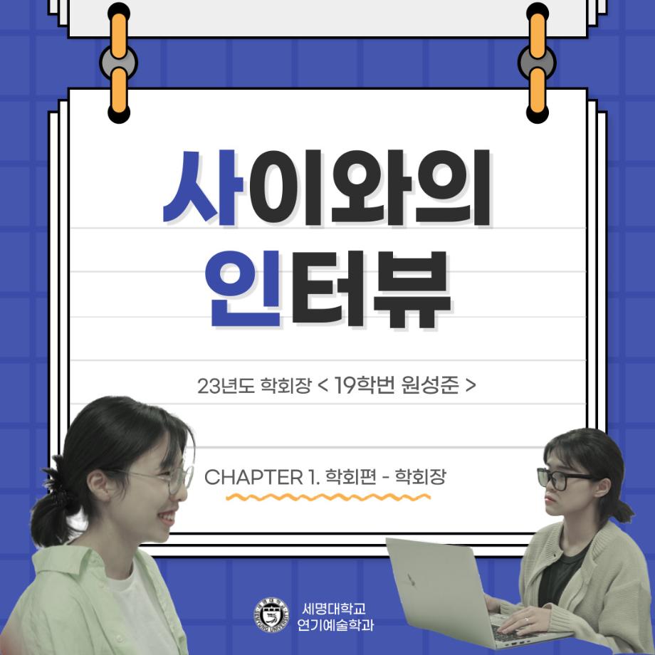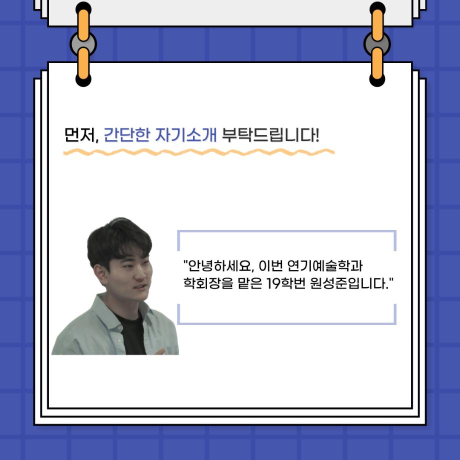 본문 시작 홈으로 커뮤니티 학과소개 입학정보 교수소개 학과과정 커뮤니티 공연예매 안내 홈페이지가이드 포토갤러리 공지사항 포토갤러리 작품DB 동아리 학사일정 학생회 포토갤러리 페이스북 트위터 프린트 🎙사이와의 인터뷰 - 23년도 학회장 ‘원성준’🎙 연기예술학과 2879 2023-05-23 안녕하십니까! 23년도 학회 '사이'입니다. 학회 '사이'의 첫번째 인터뷰로 연기예술학과 23년도 학회장인 원성준 학회장과 인터뷰를 진행했습니다. 학회를 맡은 소감과 학회장이 되기로 결심한 계기, 학과생들에게 전하고 싶은 말 등 다양한 인터뷰를 진행하였습니다. 앞으로 있을 인터뷰 컨텐츠 '사인' 많은 사랑 부탁드립니다. 목록 이전[2023-1학기] 원격수업사이버강좌 기말고사 시험 진행 안내 모바일응시불가 다음 [밀어주는 위원회] 2023년 꿈 실현 장학금 신청 안내 담당부서 : 연기예술학과 담당자 : - 연락처 : 043-649-1733 최종수정일 : 2024-10-26 만족도조사 만족도 조사 이 페이지에서 제공하는 정보에 대하여 만족하시나요? 매우만족 만족 보통 불만족 매우불만족
