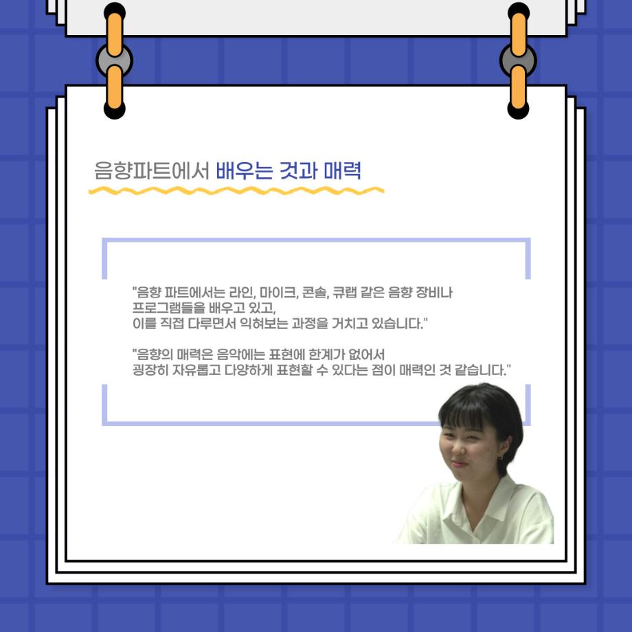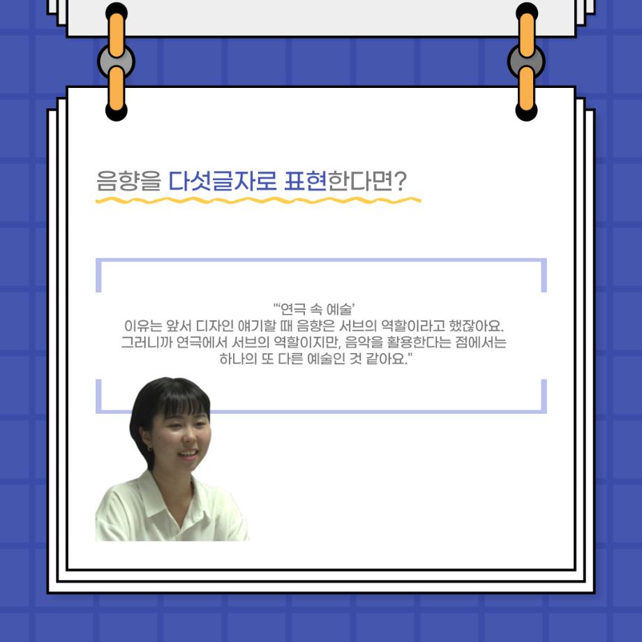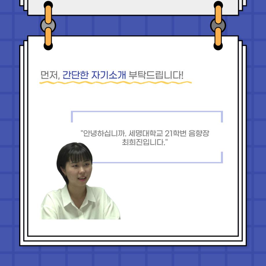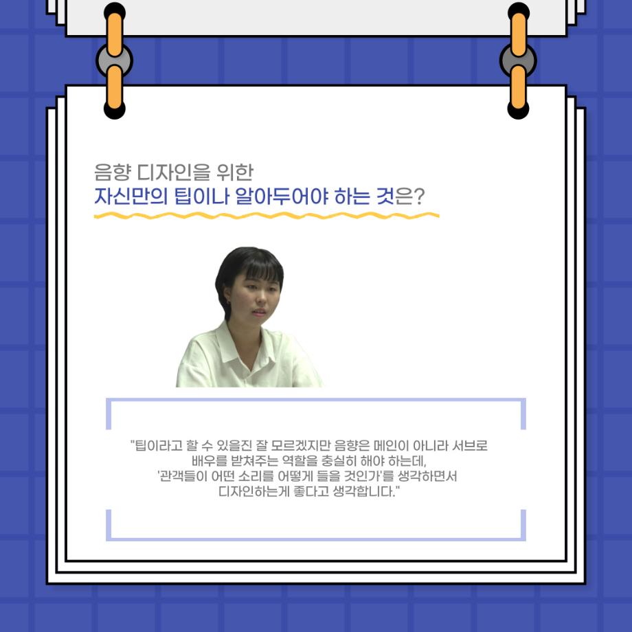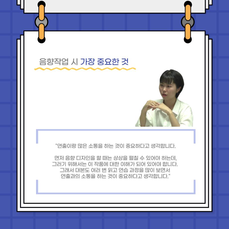본문 시작 홈으로 커뮤니티 학과소개 입학정보 교수소개 학과과정 커뮤니티 공연예매 안내 홈페이지가이드 포토갤러리 공지사항 포토갤러리 작품DB 동아리 학사일정 학생회 포토갤러리 페이스북 트위터 프린트 사이와의 인터뷰 - 23년도 음향장 ‘최희진‘ 연기예술학과 3296 2023-07-24 안녕하십니까! 23년도 학회 ‘사이’입니다! 학회 ‘사이’의 다섯번째 인터뷰로 연기예술학과 23년도 음향장인 최희진 학생과 인터뷰하는 시간을 가졌습니다! 이번 인터뷰에서는 음향에 대한 매력과 음향 작업에서 가장 중요한 것, 음향 작업에서 알아두어야 하는 것 등에 대해 인터뷰하였습니 앞으로 있을 인터뷰 컨텐츠 ‘사인’도 많은 사랑 부탁드립니다. 목록 이전제 97회 세명대학교 연기예술학과 정기공연 하계 프로젝트 < 첼로와 케찹 > 다음 제 98회 세명대학교 연기예술학과 정기공연 하계 프로젝트 - < 하녀들 > 담당부서 : 연기예술학과 담당자 : - 연락처 : 043-649-1733 최종수정일 : 2024-10-26 만족도조사 만족도 조사 이 페이지에서 제공하는 정보에 대하여 만족하시나요? 매우만족 만족 보통 불만족 매우불만족