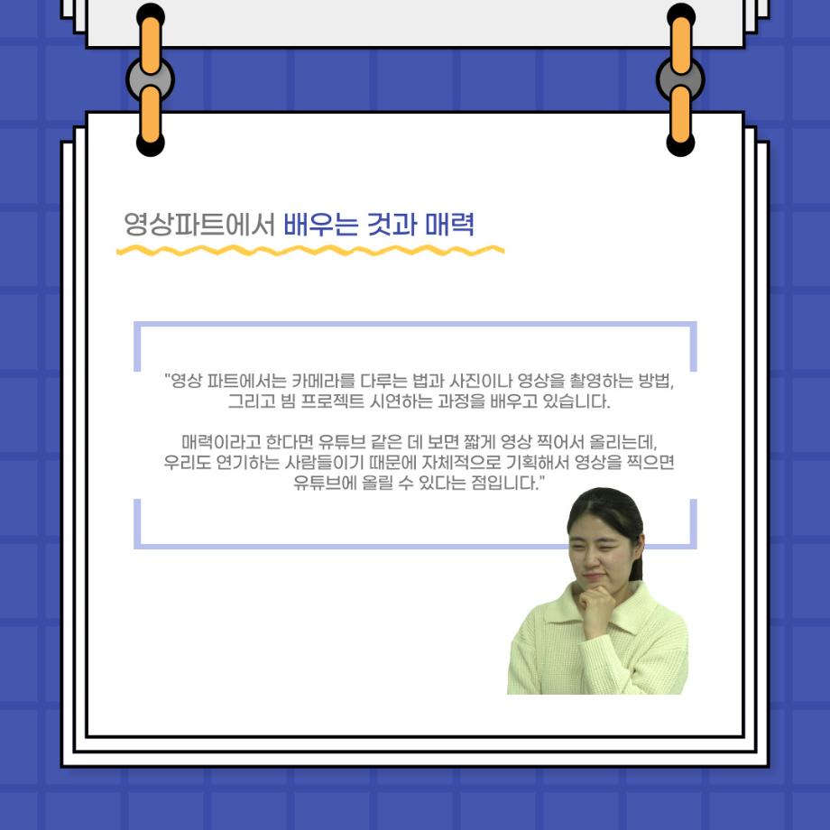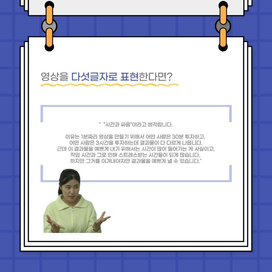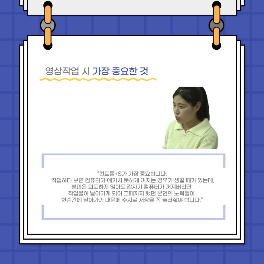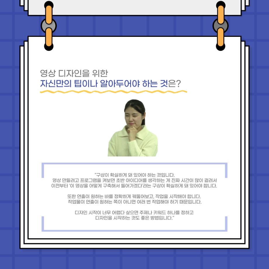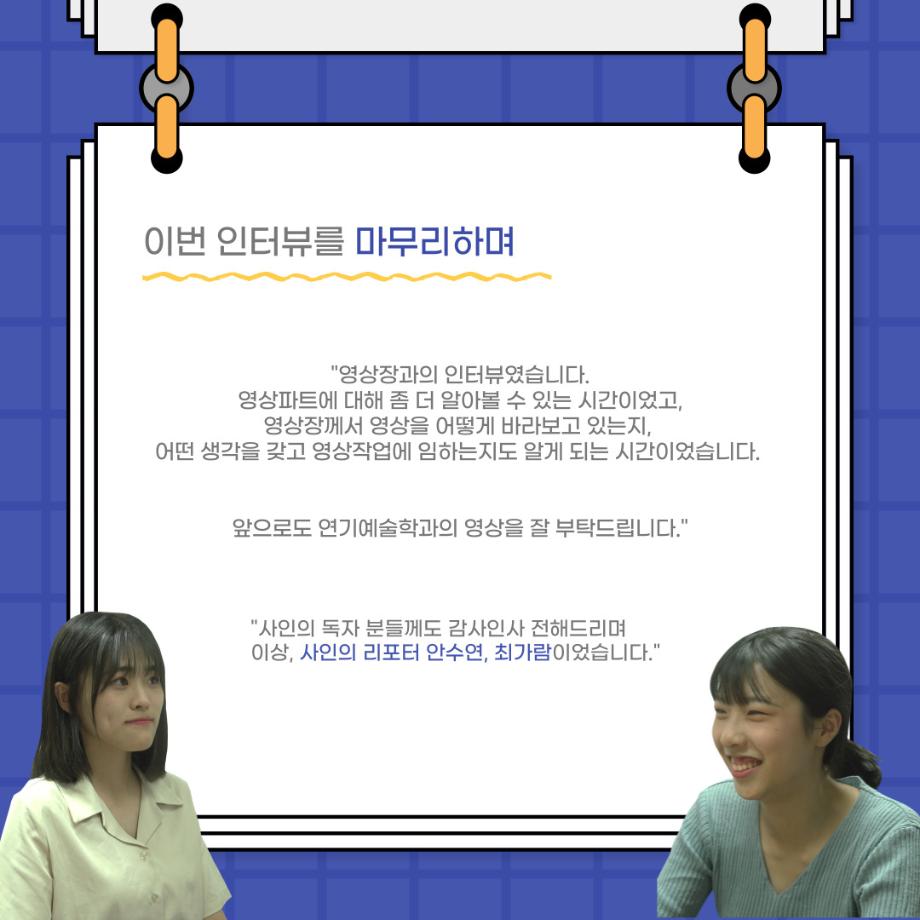 본문 시작 홈으로 커뮤니티 학과소개 입학정보 교수소개 학과과정 커뮤니티 공연예매 안내 홈페이지가이드 포토갤러리 공지사항 포토갤러리 작품DB 동아리 학사일정 학생회 포토갤러리 페이스북 트위터 프린트 사이와의 인터뷰 - 23년도 영상장 ‘양희진‘ 연기예술학과 3422 2023-10-13 안녕하십니까. 23년도 학회 ‘사이’입니다. 학회 ‘사이’의 아홉번째 인터뷰로 연기예술학과 23년도 1학기 영상장인 양희진 학생과 인터뷰하는 시간을 가졌습니다. 이번 인터뷰에서는 영상 파트의 매력과 영상 작업시 가장 중요한 것, 영상 작업에서 알아두어야 하는 것 등에 대해 인터뷰하였습니다. 다음 인터뷰 컨텐츠 ‘사인’도 많은 사랑 부탁드립니다. 목록 이전2학기 맞이 학과 대청소 다음 사이와의 인터뷰 - 23년도 영상사수 ‘안지민‘ 담당부서 : 연기예술학과 담당자 : - 연락처 : 043-649-1733 최종수정일 : 2024-10-26 만족도조사 만족도 조사 이 페이지에서 제공하는 정보에 대하여 만족하시나요? 매우만족 만족 보통 불만족 매우불만족