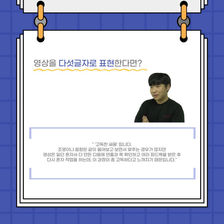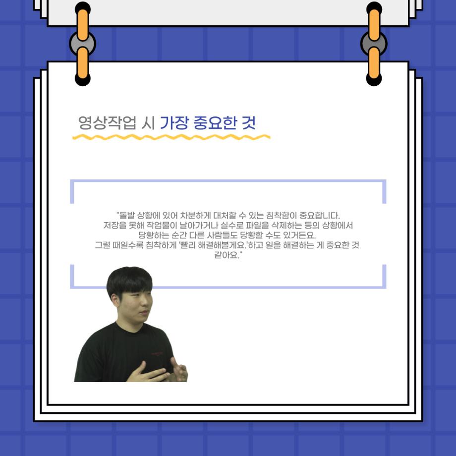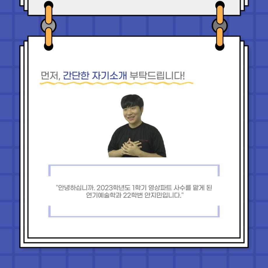 본문 시작 홈으로 커뮤니티 학과소개 입학정보 교수소개 학과과정 커뮤니티 공연예매 안내 홈페이지가이드 포토갤러리 공지사항 포토갤러리 작품DB 동아리 학사일정 학생회 포토갤러리 페이스북 트위터 프린트 사이와의 인터뷰 - 23년도 영상사수 ‘안지민‘ 연기예술학과 4019 2023-10-13 안녕하십니까. 23년도 학회 ‘사이’입니다. 학회 ‘사이’의 열번째 인터뷰로 연기예술학과 23년도 1학기 영상 사수인 안지민 학생과 인터뷰하는 시간을 가졌습니다. 이번 인터뷰에서는 영상 파트의 매력과 영상 작업시 가장 중요한 것, 영상 작업에서 알아두어야 하는 것 등에 대해 인터뷰하였습니다. 다음 인터뷰 컨텐츠 ‘사인’도 많은 사랑 부탁드립니다. 목록 이전사이와의 인터뷰 - 23년도 영상장 ‘양희진‘ 다음 2024학년도 세명대학교 연기예술학과 수시 진행 담당부서 : 연기예술학과 담당자 : - 연락처 : 043-649-1733 최종수정일 : 2024-10-26 만족도조사 만족도 조사 이 페이지에서 제공하는 정보에 대하여 만족하시나요? 매우만족 만족 보통 불만족 매우불만족