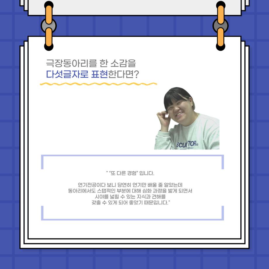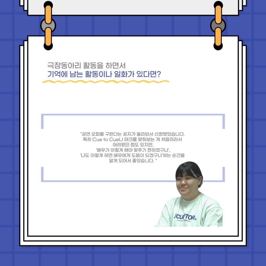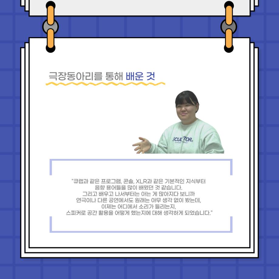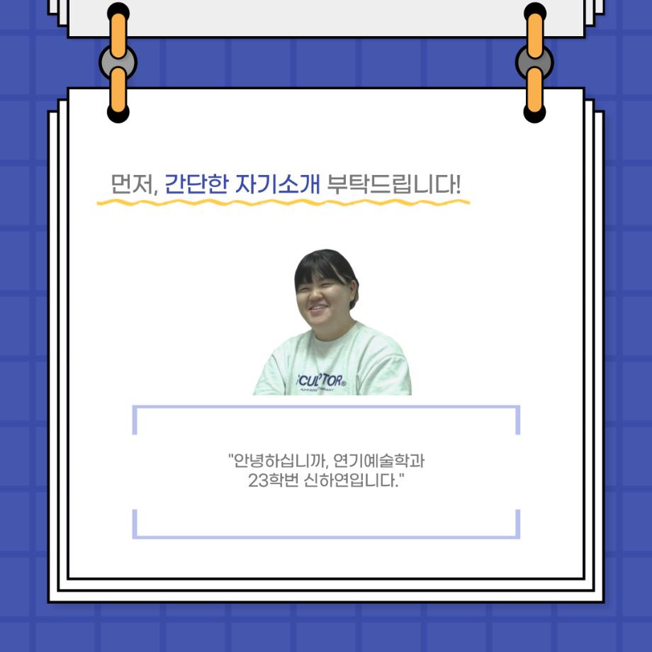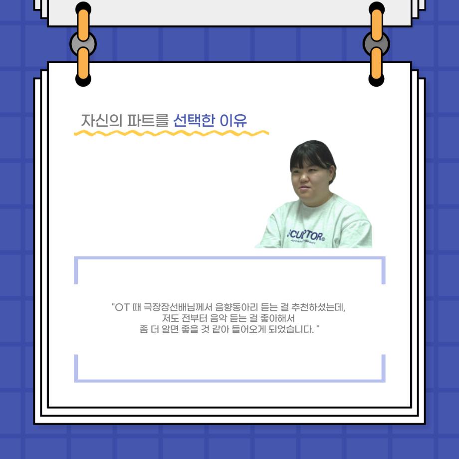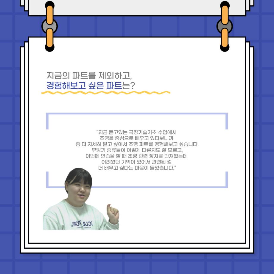 본문 시작 홈으로 커뮤니티 학과소개 입학정보 교수소개 학과과정 커뮤니티 공연예매 안내 홈페이지가이드 포토갤러리 공지사항 포토갤러리 작품DB 동아리 학사일정 학생회 포토갤러리 페이스북 트위터 프린트 사이와의 인터뷰 - 23년도 극장동아리 음향 파트 부원 ‘신하연' 연기예술학과 3162 2024-01-12 안녕하십니까. 23년도 학회 ‘사이’입니다. 학회 ‘사이’의 열네번째 인터뷰로 연기예술학과 23년도 극장동아리 음향 파트 부원인 신하연 학생과 인터뷰하는 시간을 가졌습니다. 이번 인터뷰에서는 음향파트를 선택한 이유, 극장동아리를 통해 배운 것, 동아리를 하면서 기억에 남는 활동이나 일화 등에 대해 인터뷰하였습니다. 다음 인터뷰 컨텐츠 ‘사인’도 많은 사랑 부탁드립니다. 목록 이전미래 인재를 위한 한방정밀의료 기초 교육 및 치료 체험 참가자 모집 다음 제102회 세명대학교 연기예술학과 정기공연 1학년 <에쮸드 발표회> 스틸컷 담당부서 : 연기예술학과 담당자 : - 연락처 : 043-649-1733 최종수정일 : 2024-10-26 만족도조사 만족도 조사 이 페이지에서 제공하는 정보에 대하여 만족하시나요? 매우만족 만족 보통 불만족 매우불만족