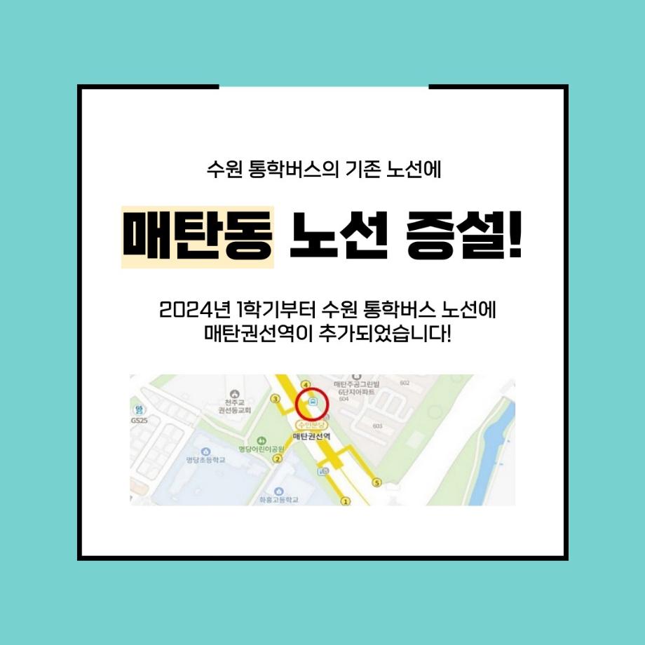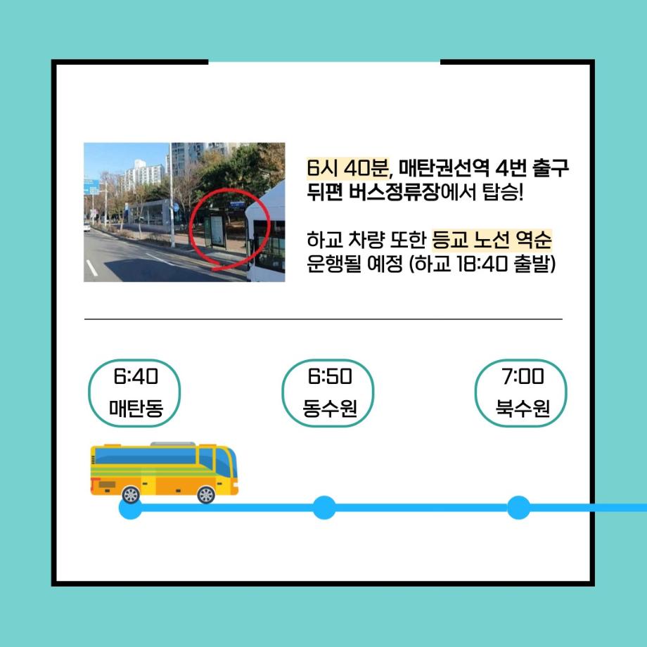 본문 시작 홈으로 커뮤니티 학과소개 입학정보 교수소개 학과과정 커뮤니티 공연예매 안내 홈페이지가이드 포토갤러리 공지사항 포토갤러리 작품DB 동아리 학사일정 학생회 포토갤러리 페이스북 트위터 프린트 세명대 통학버스, 경기 수원지역 노선 증설 연기예술학과 3281 2024-01-30 경기 수원지역 통학버스 노선에 매탄동 노선이 새롭게 증설되었습니다. 6시 40분, 매탄권선역 4번 출구 뒤편 버스정류장에서 탑승해 기존 노선(동수원, 북수원)을 지나 세명대학교까지 단숨에 하교 버스도 등고 버스 노선의 역순으로 운행된다는 사실. 더 편리해진 통학버스 타고 세명대학교로 등교하자. 목록 이전세명대학교 연기예술학과 특강 [최진영 배우님] 다음 세명대학교 연기예술학과 특강 [김낙형 연출가님] 담당부서 : 연기예술학과 담당자 : - 연락처 : 043-649-1733 최종수정일 : 2024-10-26 만족도조사 만족도 조사 이 페이지에서 제공하는 정보에 대하여 만족하시나요? 매우만족 만족 보통 불만족 매우불만족