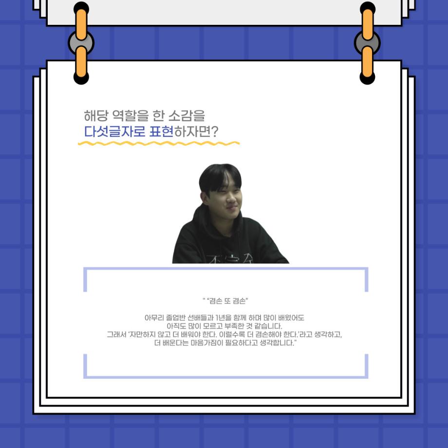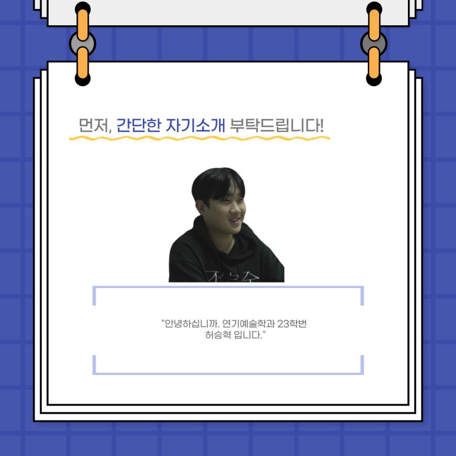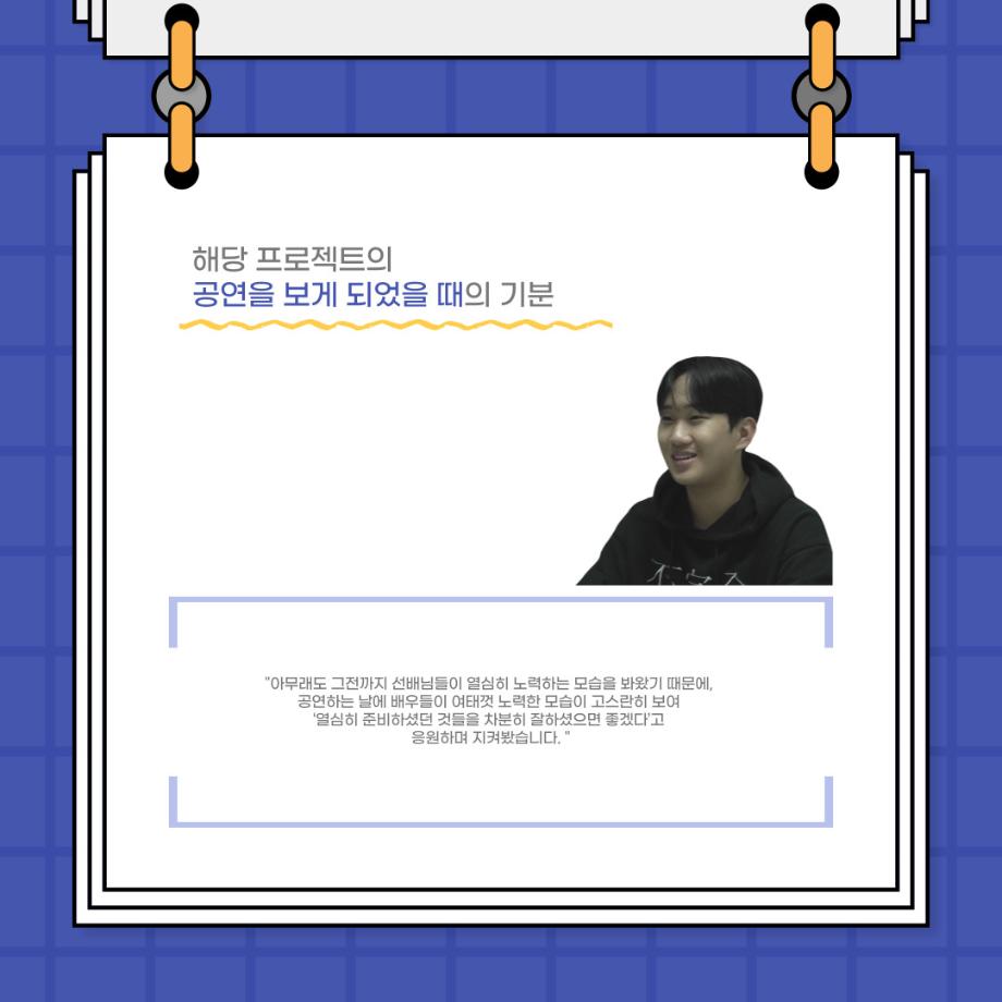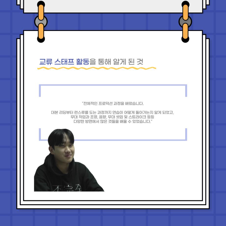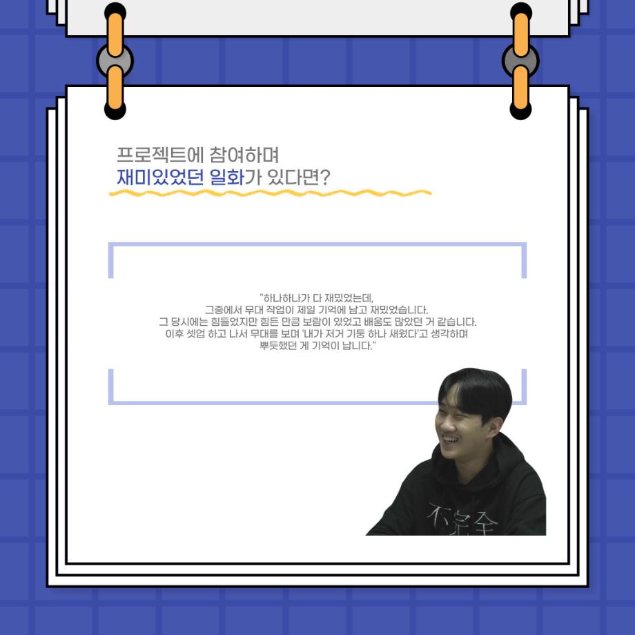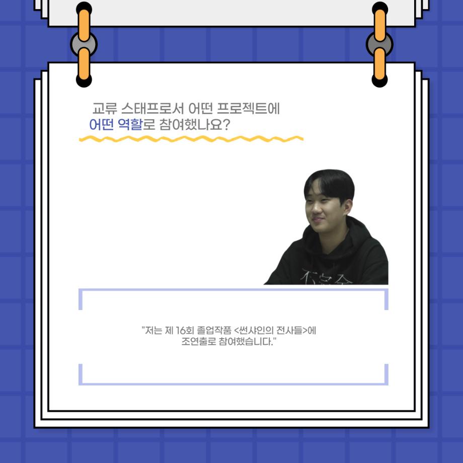 본문 시작 홈으로 커뮤니티 학과소개 입학정보 교수소개 학과과정 커뮤니티 공연예매 안내 홈페이지가이드 포토갤러리 공지사항 포토갤러리 작품DB 동아리 학사일정 학생회 포토갤러리 페이스북 트위터 프린트 사이와의 인터뷰 - 23년도 졸업작품 - 교류스탭 조연출 ‘허승혁’ 연기예술학과 3067 2024-02-12 안녕하십니까. 23년도 학회 ‘사이’입니다. 학회 ‘사이’의 스물세 번째 인터뷰로 연기예술학과 23년도 졸업작품 <썬샤인의 전사들>에서 교류 스탭으로 참여한 허승혁 학생과 인터뷰하는 시간을 가졌습니다. 이번 인터뷰에서는 졸업작품 <썬샤인의 전사들> 교류 스탭으로 참여하면서 알게 된 것, 재미있었던 일화, 공연 봤을 때의 기분 등에 대해 인터뷰하였습니다. 다음 인터뷰 컨텐츠 ‘사인’도 많은 사랑 부탁드립니다. 목록 이전2024학년도 세명대학교 합격자 등록 안내 다음 사이와의 인터뷰 - 23년도 졸업작품 - 교류스탭 분장팀장 ‘송현아’ 담당부서 : 연기예술학과 담당자 : - 연락처 : 043-649-1733 최종수정일 : 2024-10-26 만족도조사 만족도 조사 이 페이지에서 제공하는 정보에 대하여 만족하시나요? 매우만족 만족 보통 불만족 매우불만족