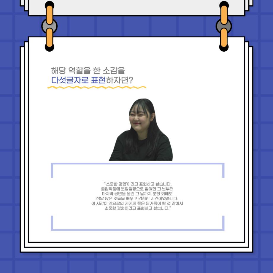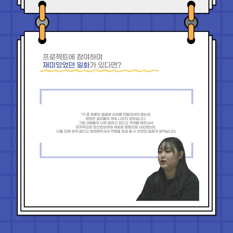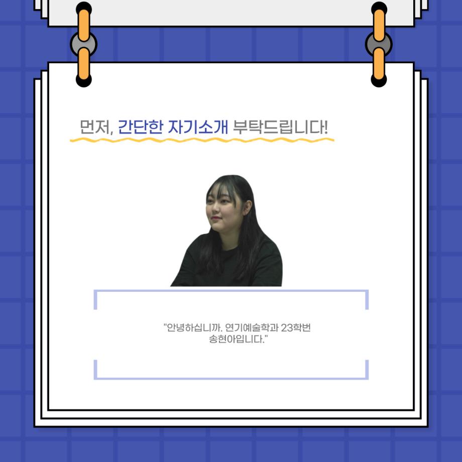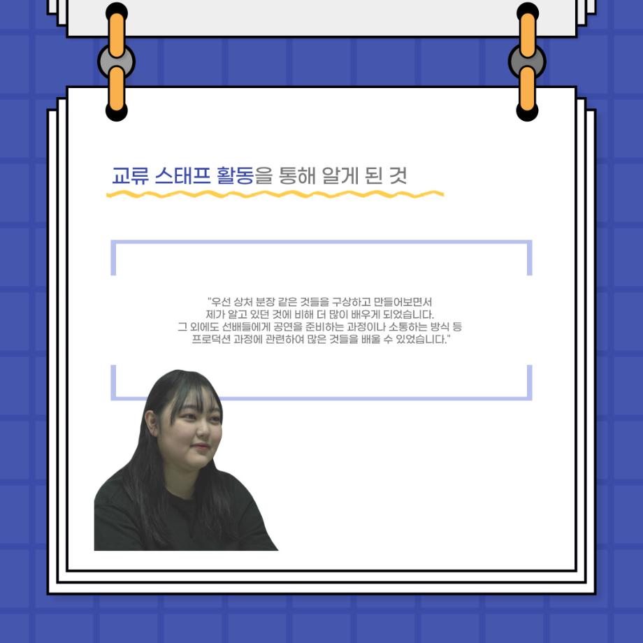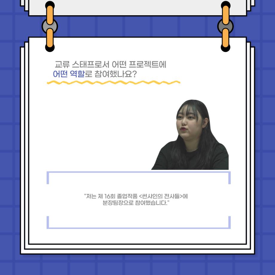 본문 시작 홈으로 커뮤니티 학과소개 입학정보 교수소개 학과과정 커뮤니티 공연예매 안내 홈페이지가이드 포토갤러리 공지사항 포토갤러리 작품DB 동아리 학사일정 학생회 포토갤러리 페이스북 트위터 프린트 사이와의 인터뷰 - 23년도 졸업작품 - 교류스탭 분장팀장 ‘송현아’ 연기예술학과 3088 2024-02-12 안녕하십니까. 23년도 학회 ‘사이’입니다. 학회 ‘사이’의 스물네 번째 인터뷰로 연기예술학과 23년도 졸업작품 <썬샤인의 전사들>에서 교류 스탭으로 참여한 송현아 학생과 인터뷰하는 시간을 가졌습니다. 이번 인터뷰에서는 졸업작품 <썬샤인의 전사들> 교류 스탭으로 참여하면서 알게 된 것, 재미있었던 일화, 공연 봤을 때의 기분 등에 대해 인터뷰하였습니다. 다음 인터뷰 컨텐츠 ‘사인’도 많은 사랑 부탁드립니다. 목록 이전사이와의 인터뷰 - 23년도 졸업작품 - 교류스탭 조연출 ‘허승혁’ 다음 연기예술학과 103회 정기공연 동계 프로젝트 <올모스트 메인> 프로필 스틸컷 담당부서 : 연기예술학과 담당자 : - 연락처 : 043-649-1733 최종수정일 : 2024-10-26 만족도조사 만족도 조사 이 페이지에서 제공하는 정보에 대하여 만족하시나요? 매우만족 만족 보통 불만족 매우불만족