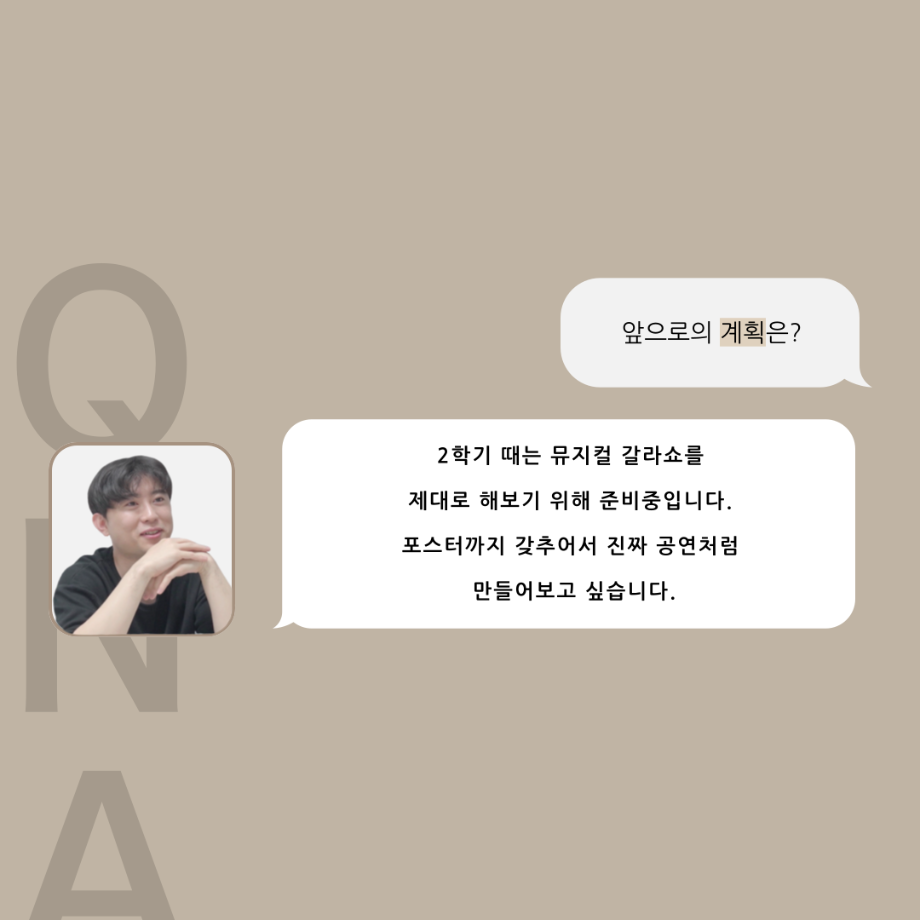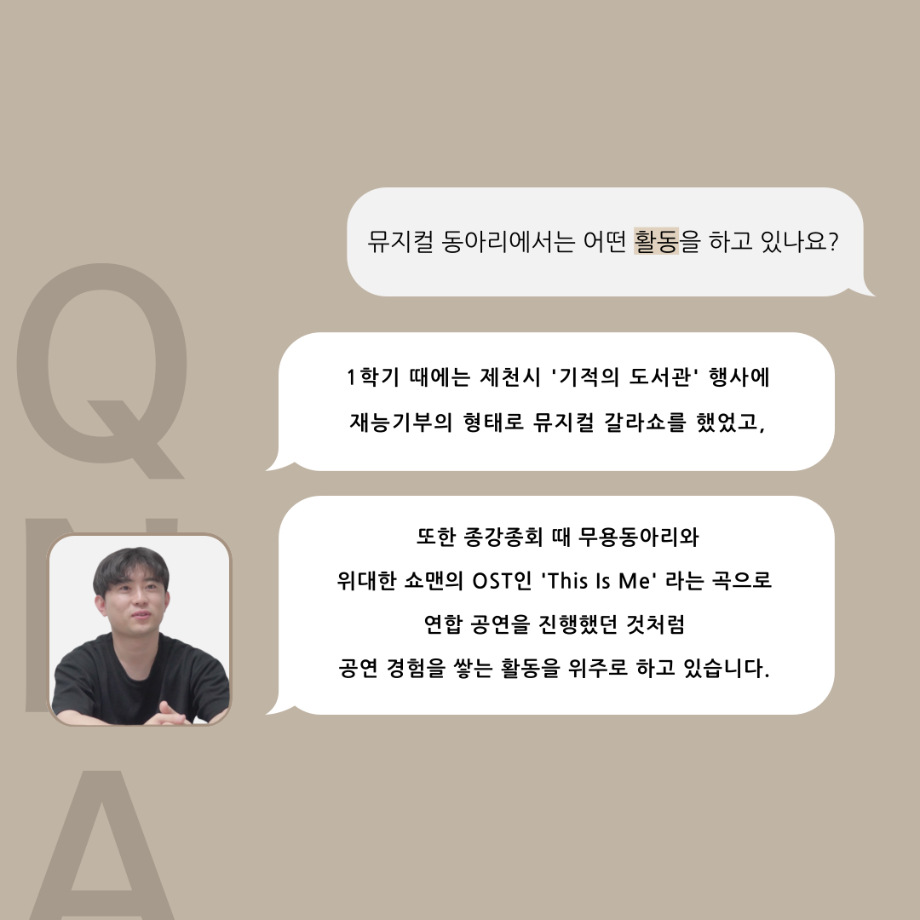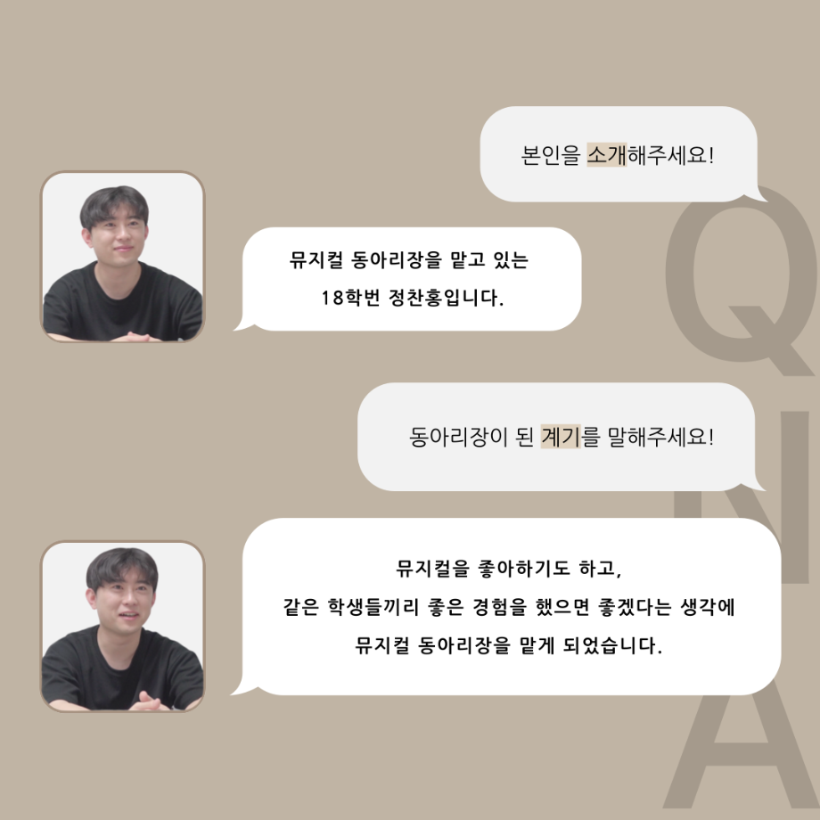 본문 시작 홈으로 커뮤니티 학과소개 입학정보 교수소개 학과과정 커뮤니티 공연예매 안내 홈페이지가이드 포토갤러리 공지사항 포토갤러리 작품DB 동아리 학사일정 학생회 포토갤러리 페이스북 트위터 프린트 '품'위있는 인'터뷰' - 24년도 뮤지컬동아리장 <정찬홍> 연기예술학과 3237 2024-07-31 안녕하십니까. 24년도 학회 ‘품‘ 입니다. 학회 ‘품’의 여덟 번째 인터뷰로 세명대학교 연기예술학과 24학년도 뮤지컬동아리장인 정찬홍 학우와 인터뷰 하는 시간을 가졌습니다. 뮤지컬 동아리장이 된 계기와 동아리에서는 어떤 활동을 하고있는지, 앞으로의 계획은 무엇으며 동아리 부원들에게 전하고 싶은 말 등을 질문하는 시간을 가졌습니다. 앞으로 있을 인터뷰 컨텐츠인 '품터뷰' 많은 사랑 부탁드립니다. 목록 다음 2024학년도 1학기 기말 수업평가 결과 조회 안내 다음 '품'위있는 인'터뷰' - 24년도 배우훈련동아리장 <정성주> 담당부서 : 연기예술학과 담당자 : - 연락처 : 043-649-1733 최종수정일 : 2024-10-26 만족도조사 만족도 조사 이 페이지에서 제공하는 정보에 대하여 만족하시나요? 매우만족 만족 보통 불만족 매우불만족