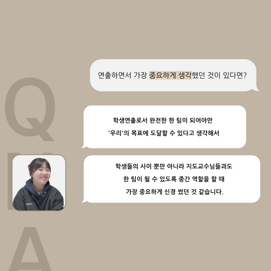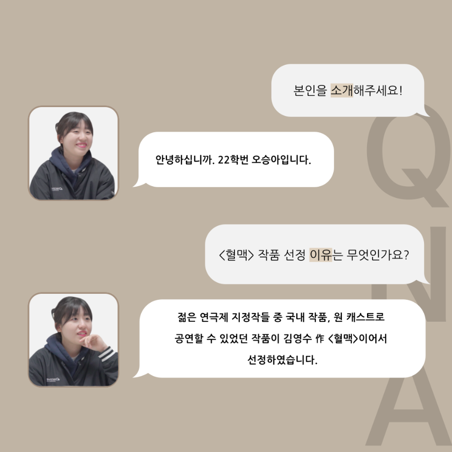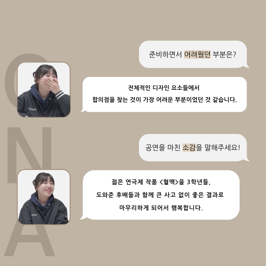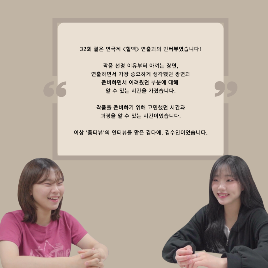 본문 시작 홈으로 커뮤니티 학과소개 입학정보 교수소개 학과과정 커뮤니티 공연예매 안내 홈페이지가이드 포토갤러리 공지사항 포토갤러리 작품DB 동아리 학사일정 학생회 포토갤러리 페이스북 트위터 프린트 '품'위있는 인'터뷰' - 24년도 젊은연극제 학생 연출 <오승아> 연기예술학과 3272 2024-08-07 안녕하십니까. 24년도 학회 ‘품’ 입니다. 학회 ‘품’의 열번째 인터뷰로 세명대학교 연기예술학과 24학년도 젊은연극제 참가작 <혈맥>의 학생 연출 오승아 학우와 인터뷰 하는 시간을 가졌습니다. 작품 선정 이유부터 아끼는 장면, 연출하면서 가장 중요하게 생각했던 장면과 작품을 준비하면서 어려웠던 부분에 대해 알 수 있는 시간을 가졌습니다. 앞으로 있을 인터뷰 컨텐츠인 ‘품터뷰’ 많은 사랑 부탁드립니다. 목록 다음 2024학년도 진로플러스업 캠프 참여자 모집 다음 ‘품’위있는 인‘터뷰’ - 24년도 젊은연극제 원팔役 <박성민> 담당부서 : 연기예술학과 담당자 : - 연락처 : 043-649-1733 최종수정일 : 2024-10-26 만족도조사 만족도 조사 이 페이지에서 제공하는 정보에 대하여 만족하시나요? 매우만족 만족 보통 불만족 매우불만족