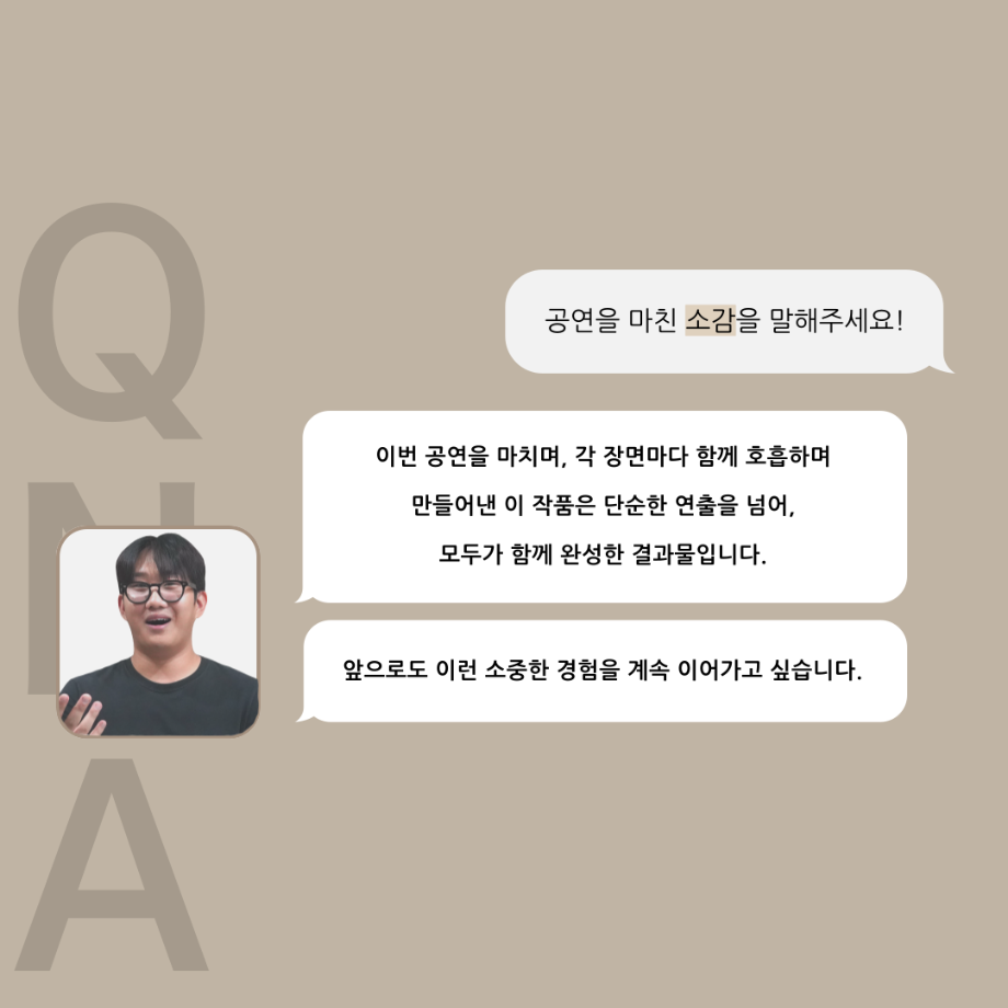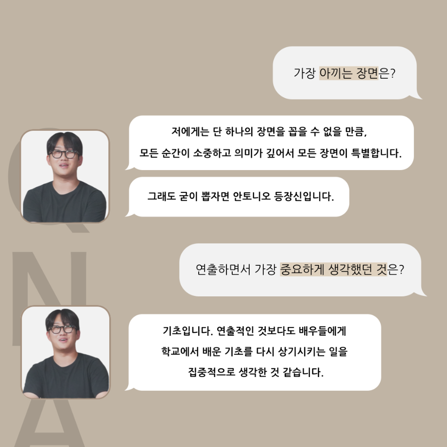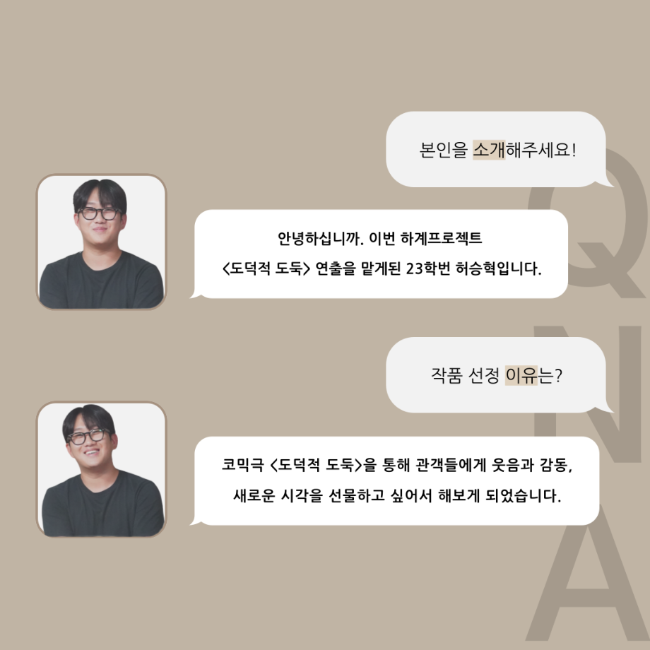 본문 시작 홈으로 커뮤니티 학과소개 입학정보 교수소개 학과과정 커뮤니티 공연예매 안내 홈페이지가이드 포토갤러리 공지사항 포토갤러리 작품DB 동아리 학사일정 학생회 포토갤러리 페이스북 트위터 프린트 '품'위있는 인‘터뷰’ - 24년도 하계프로젝트 학생 연출 <허승혁> 연기예술학과 3324 2024-09-11 안녕하십니까. 24년도 학회 ‘품’ 입니다. 학회 ‘품’의 열 세 번째 인터뷰로 세명대학교 연기예술학과 하계프로젝트 <도덕적도둑>의 학생 연출 허승혁 학우와 인터뷰 하는 시간을 가졌습니다. 작품 선정 이유부터 아끼는 장면, 연출하면서 가장 중요하게 생각했던 장면과 작품을 준비하면서 어려웠던 부분에 대해 알 수 있는 시간을 가졌습니다. 앞으로 있을 인터뷰 컨텐츠인 ‘품터뷰’ 많은 사랑 부탁드립니다. 목록 이전2024학년도 2학기 디지털홍보서포터즈 추가 모집 안내 다음 논문통계분석 LIVE 특강 안내 담당부서 : 연기예술학과 담당자 : - 연락처 : 043-649-1733 최종수정일 : 2024-10-26 만족도조사 만족도 조사 이 페이지에서 제공하는 정보에 대하여 만족하시나요? 매우만족 만족 보통 불만족 매우불만족