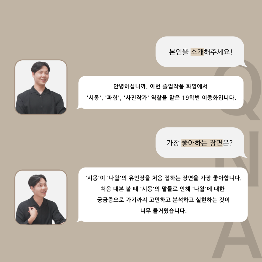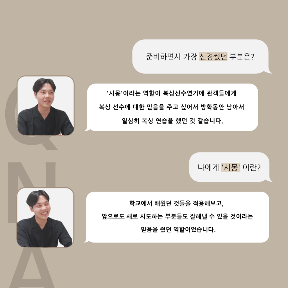 본문 시작 홈으로 커뮤니티 학과소개 입학정보 교수소개 학과과정 커뮤니티 공연예매 안내 홈페이지가이드 포토갤러리 공지사항 포토갤러리 작품DB 동아리 학사일정 학생회 포토갤러리 페이스북 트위터 프린트 ‘품’위있는 인‘터뷰’ - 24년도 졸업작품 시몽 役 <이종화> 연기예술학과 3407 2024-12-24 안녕하십니까. 24년도 학회 ‘품’ 입니다. 학회 ‘품’의 스무 번째 인터뷰로 세명대학교 연기예술학과 제 17회 졸업작품 <화염>의 시몽 역인 이종화 학우와 인터뷰 하는 시간을 가졌습니다. 가장 좋아하는 장면, 자신의 배역을 제외하고 해보고 싶은 배역 그리고 준비하면서 어려웠던 부분과 공연을 마친 소감 등에 대해 인터뷰 하는 시간을 가졌습니다. 앞으로 있을 인터뷰 컨텐츠인 ‘품터뷰’ 많은 사랑 부탁드립니다. 목록 이전‘품’위있는 인‘터뷰’ - 24년도 졸업작품 잔느 役 <최희진> 다음 세명대학교 연기예술학과 정시모집 담당부서 : 연기예술학과 담당자 : - 연락처 : 043-649-1733 최종수정일 : 2024-10-26 만족도조사 만족도 조사 이 페이지에서 제공하는 정보에 대하여 만족하시나요? 매우만족 만족 보통 불만족 매우불만족