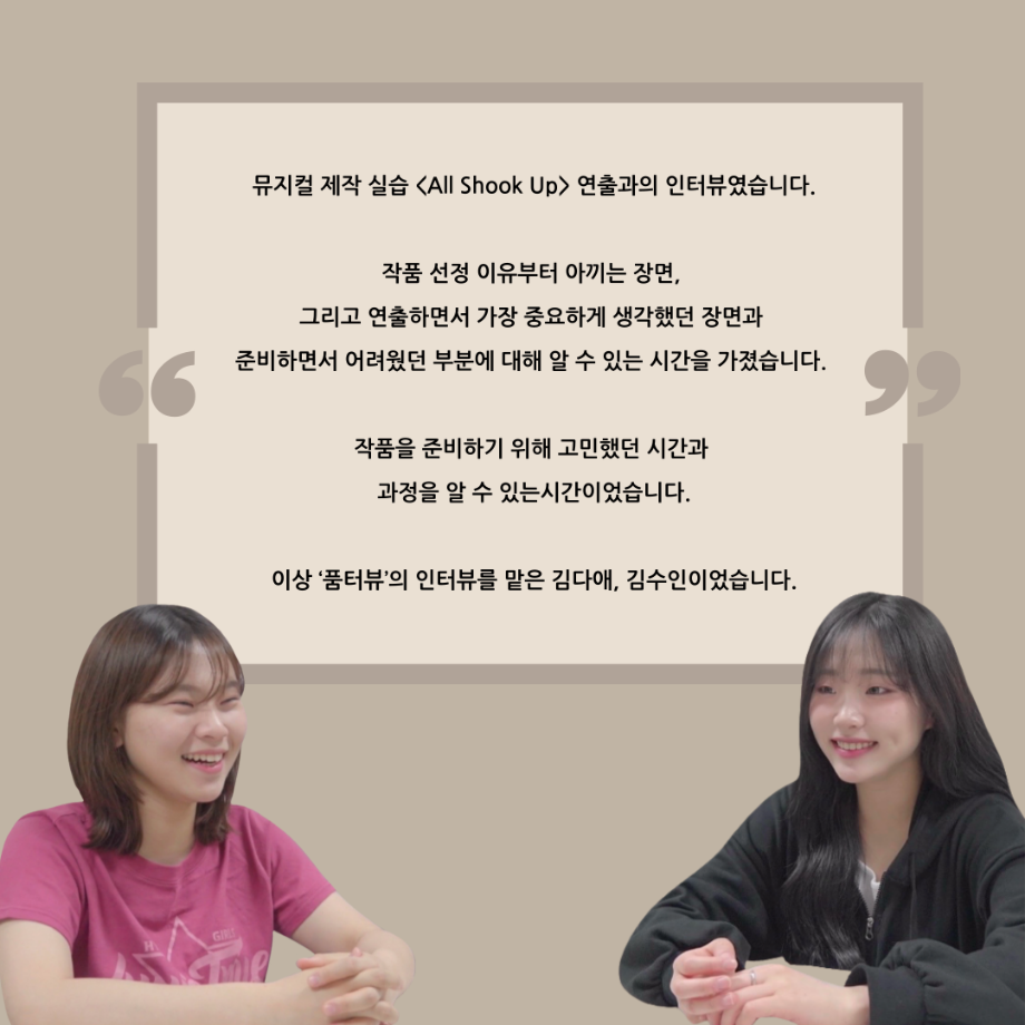 본문 시작 홈으로 커뮤니티 학과소개 입학정보 교수소개 학과과정 커뮤니티 공연예매 안내 홈페이지가이드 포토갤러리 공지사항 포토갤러리 작품DB 동아리 학사일정 학생회 포토갤러리 페이스북 트위터 프린트 ‘품’위있는 인‘터뷰’ - 24년도 뮤지컬제작실습 학생 연출 <임소정> 연기예술학과 3414 2025-01-09 . 목록 이전세명대학교 연기예술학과 정시모집 다음 ‘품’ 위 있는 인 ‘터뷰’ - 뮤지컬 제작실습 <올슉업> 채드 연세호 카드 뉴스 담당부서 : 연기예술학과 담당자 : - 연락처 : 043-649-1733 최종수정일 : 2024-10-26 만족도조사 만족도 조사 이 페이지에서 제공하는 정보에 대하여 만족하시나요? 매우만족 만족 보통 불만족 매우불만족