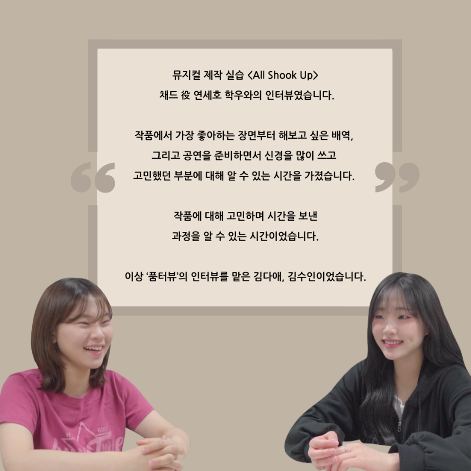 본문 시작 홈으로 커뮤니티 학과소개 입학정보 교수소개 학과과정 커뮤니티 공연예매 안내 홈페이지가이드 포토갤러리 공지사항 포토갤러리 작품DB 동아리 학사일정 학생회 포토갤러리 페이스북 트위터 프린트 ‘품’ 위 있는 인 ‘터뷰’ - 뮤지컬 제작실습 <올슉업> 채드 연세호 카드 뉴스 연기예술학과 2561 2025-01-10 . 목록 이전‘품’위있는 인‘터뷰’ - 24년도 뮤지컬제작실습 학생 연출 <임소정> 다음 ‘품’ 위 있는 인 ‘터뷰’ - 뮤지컬 제작실습 <올슉업> 나탈리 안수연 카드 뉴스 담당부서 : 연기예술학과 담당자 : - 연락처 : 043-649-1733 최종수정일 : 2024-10-26 만족도조사 만족도 조사 이 페이지에서 제공하는 정보에 대하여 만족하시나요? 매우만족 만족 보통 불만족 매우불만족