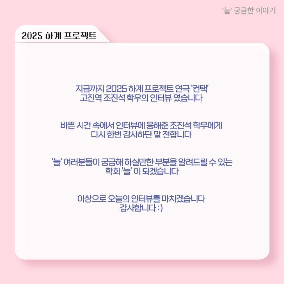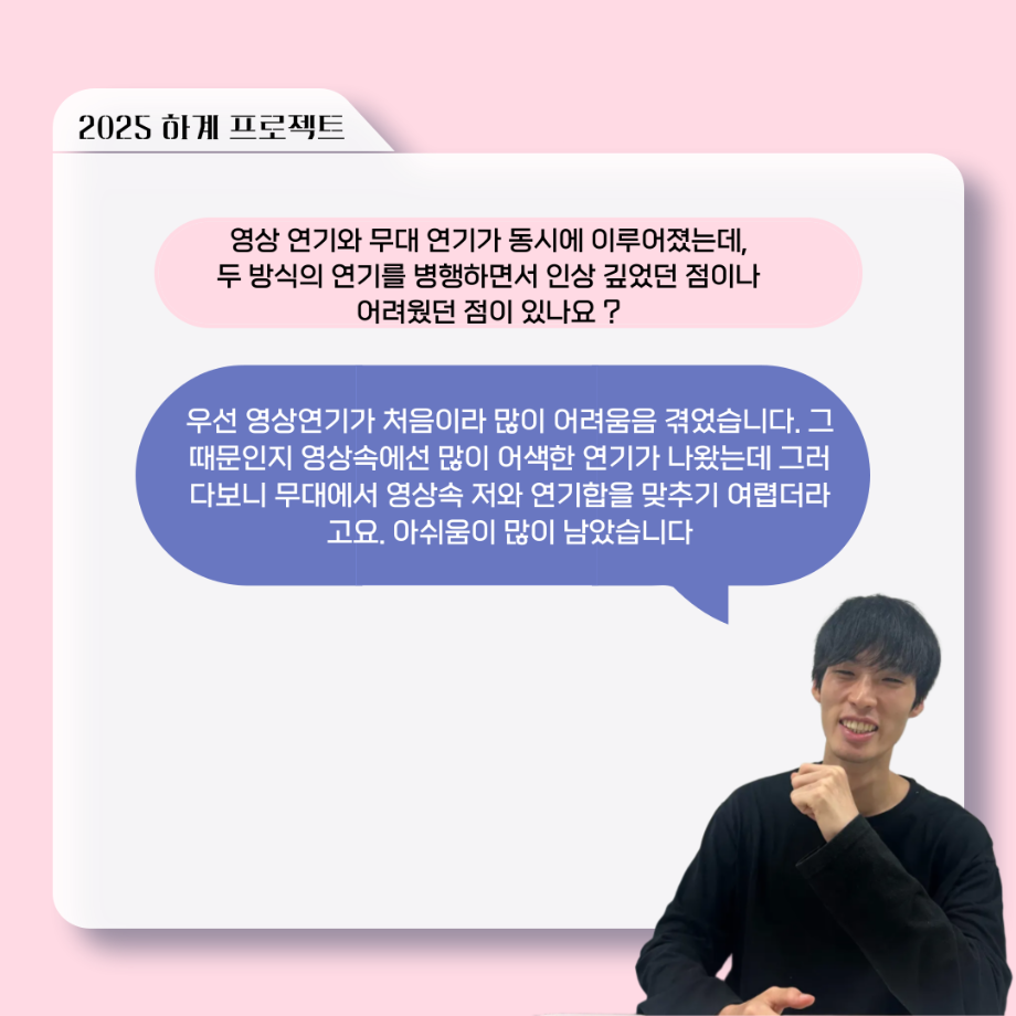 본문 시작 홈으로 커뮤니티 학과소개 입학정보 교수소개 학과과정 커뮤니티 공연예매 안내 홈페이지가이드 포토갤러리 공지사항 포토갤러리 작품DB 동아리 학사일정 학생회 포토갤러리 페이스북 트위터 프린트 ‘늘‘ 궁금한 이야기 - 하계 프로젝트 ‘컨택’팀 고진役 < 조진석 > 연기예술학과 2205 2025-10-31 . 목록 이전‘늘‘ 궁금한 이야기 - 현장실습 < 신하연 > 다음 세명대학교 연기예술학과 과체전 담당부서 : 연기예술학과 담당자 : - 연락처 : 043-649-1733 최종수정일 : 2024-10-26 만족도조사 만족도 조사 이 페이지에서 제공하는 정보에 대하여 만족하시나요? 매우만족 만족 보통 불만족 매우불만족