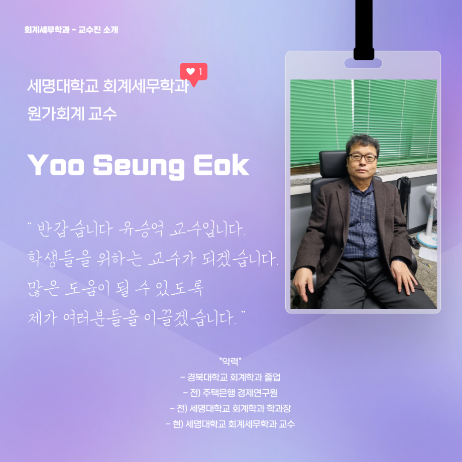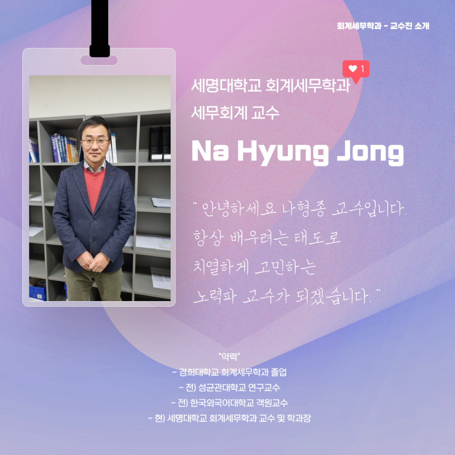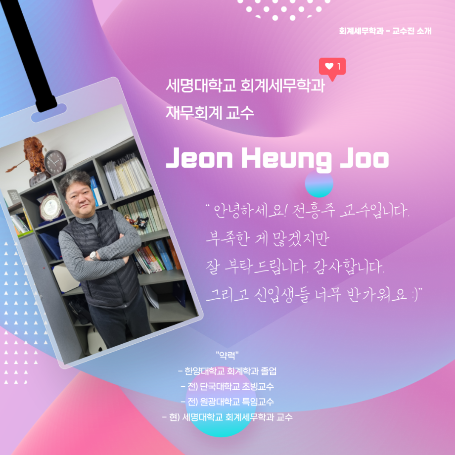 본문 시작 홈으로 학과소식 학과소개 취업정보 교육과정 학과소식 홈페이지가이드 포토갤러리 공지사항 포토갤러리 학과이야기 학과행사 포토갤러리 페이스북 트위터 프린트 회계세무학과 교수님들을 소개합니다. 회계세무학과 2102 2022-02-08 세명대학교 회계세무학과 교수님들을 소개합니다. 목록 이전세명대학교 장점 5가지 다음 대학생이 되면 달라지는 것들 담당부서 : 회계세무학과 담당자 : - 연락처 : 043-649-1244 최종수정일 : 2024-10-26 만족도조사 만족도 조사 이 페이지에서 제공하는 정보에 대하여 만족하시나요? 매우만족 만족 보통 불만족 매우불만족