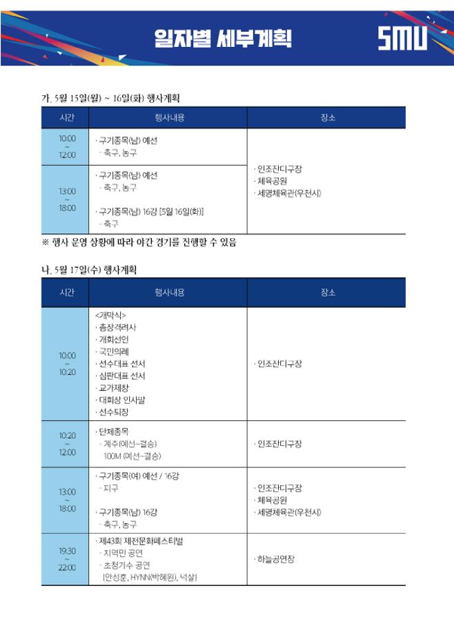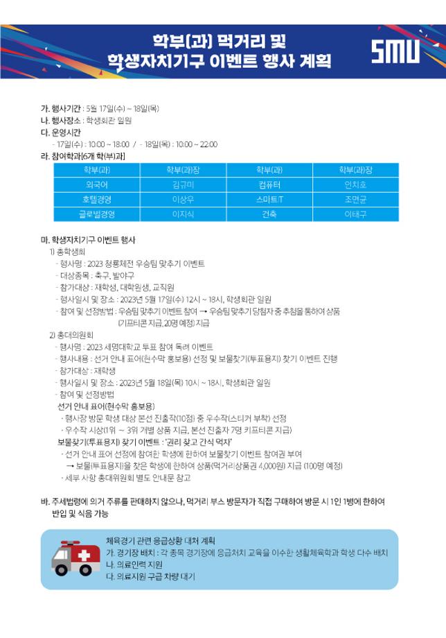 본문 시작 홈으로 학과소식 학과소개 취업정보 교육과정 학과소식 홈페이지가이드 포토갤러리 공지사항 포토갤러리 학과이야기 학과행사 포토갤러리 페이스북 트위터 프린트 세명대학교 제30회 청룡체전 회계세무학과 9166 2023-05-15 세명대학교 제30회 청룡축전!🎉 2023.05.17.(수)~19.(금) 체육대회와 더불어 먹거리 행사 및 다양한 이벤트도 함께 진행된다고 합니다😍 많은 관심과 참여 부탁드립니다!!! 목록 이전세명대학교 <등록금 책임환불제> 다음 2023학년도 세명대학교 하계방학 체류형 프로그램 개방 안내 담당부서 : 회계세무학과 담당자 : - 연락처 : 043-649-1244 최종수정일 : 2024-10-26 만족도조사 만족도 조사 이 페이지에서 제공하는 정보에 대하여 만족하시나요? 매우만족 만족 보통 불만족 매우불만족