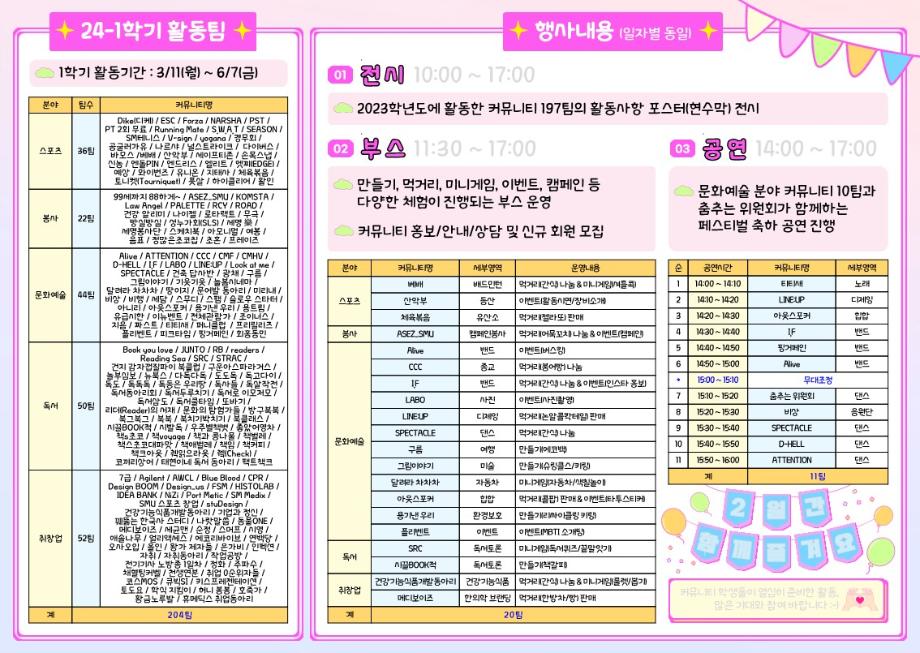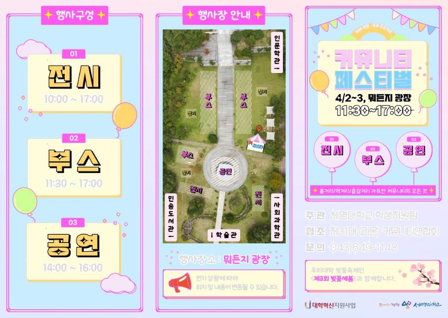 본문 시작 홈으로 학과소식 학과소개 취업정보 교육과정 학과소식 홈페이지가이드 포토갤러리 공지사항 포토갤러리 학과이야기 학과행사 포토갤러리 페이스북 트위터 프린트 제9회 커뮤니티 페스티벌 회계세무학과 1502 2024-03-29 1824 경험 · 공유 프로젝트, 제9회 커뮤니티 페스티벌! 💙 4월 2일(화) ~ 3일(수) 💙 11시30분부터 17시까지 💙 뭐든지 광장에서! 1824 커뮤니티 197팀의 ✨활동 사항 포스터 전시 감상✨과 20팀의 ✨부스를 체험✨하고 문화예술분야 커뮤니티 10팀과 춤추는 위원회의 ✨페스티벌 축하 공연✨까지 모두 함께 즐기자!😎😎 제9회 커뮤니티 페스티벌은 제3회 벚꽃세봄 축제와 함께 진행됩니다🌸✨ 목록 이전「제2회 레드로드 국제 스트리트 댄스 페스티벌」 안내 다음 🌸 제3회 벚꽃세봄 🌸 담당부서 : 회계세무학과 담당자 : - 연락처 : 043-649-1244 최종수정일 : 2024-10-26 만족도조사 만족도 조사 이 페이지에서 제공하는 정보에 대하여 만족하시나요? 매우만족 만족 보통 불만족 매우불만족