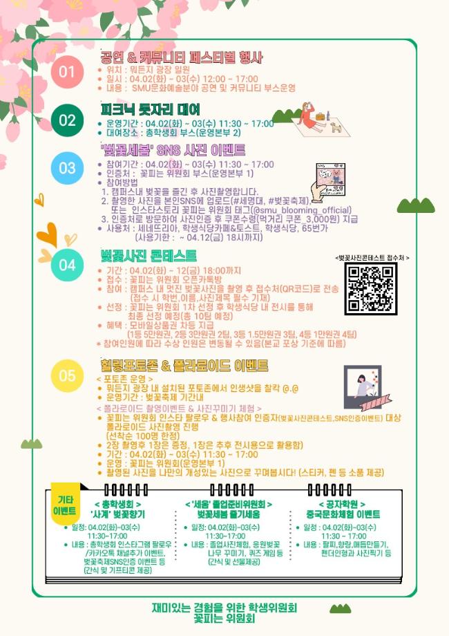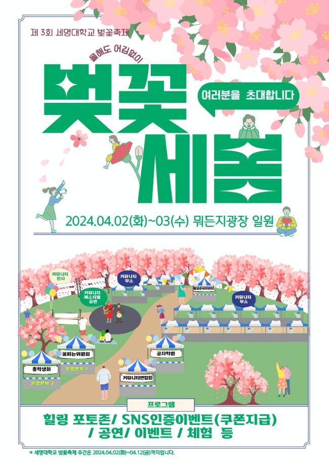 본문 시작 홈으로 학과소식 학과소개 취업정보 교육과정 학과소식 홈페이지가이드 포토갤러리 공지사항 포토갤러리 학과이야기 학과행사 포토갤러리 페이스북 트위터 프린트 🌸 제3회 벚꽃세봄 🌸 회계세무학과 1757 2024-03-29 🌸 올해도 어김없이, 제3회 벚꽃세봄 🌸 제3회 세명대학교 벚꽃축제, 벚꽃세봄에 여러분을 초대합니다! 힐링 포토존, SNS 인증 이벤트, 공연 등 다양한 프로그램과 함께 세명대학교의 벚꽃을 즐겨요🥰 💌 일자: 4월 2일(화) ~ 3일(수) 💌 장소: 뭐든지광장 일원 목록 이전제9회 커뮤니티 페스티벌 다음 [Book 콘서트] '김선태 (충TV)' Book 콘서트에 초대합니다. 담당부서 : 회계세무학과 담당자 : - 연락처 : 043-649-1244 최종수정일 : 2024-10-26 만족도조사 만족도 조사 이 페이지에서 제공하는 정보에 대하여 만족하시나요? 매우만족 만족 보통 불만족 매우불만족