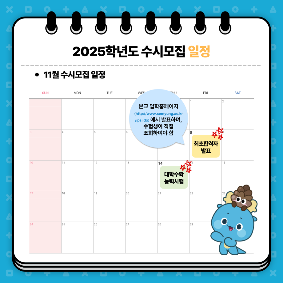 본문 시작 홈으로 학과소식 학과소개 취업정보 교육과정 학과소식 홈페이지가이드 포토갤러리 공지사항 포토갤러리 학과이야기 학과행사 포토갤러리 페이스북 트위터 프린트 세명대학교 2025학년도 수시모집 안내 회계세무학과 1448 2024-08-20 세명대학교 2025학년도 수시모집 안내 목록 이전2024 공정채용 숏폼 공모전 다음 2024학년도 세명대학교 홍보영상 담당부서 : 회계세무학과 담당자 : - 연락처 : 043-649-1244 최종수정일 : 2024-10-26 만족도조사 만족도 조사 이 페이지에서 제공하는 정보에 대하여 만족하시나요? 매우만족 만족 보통 불만족 매우불만족