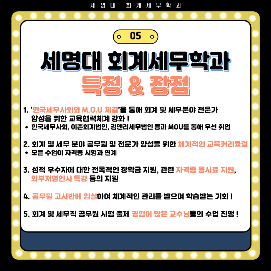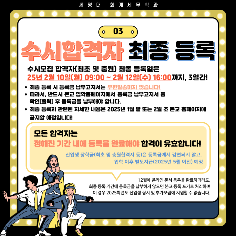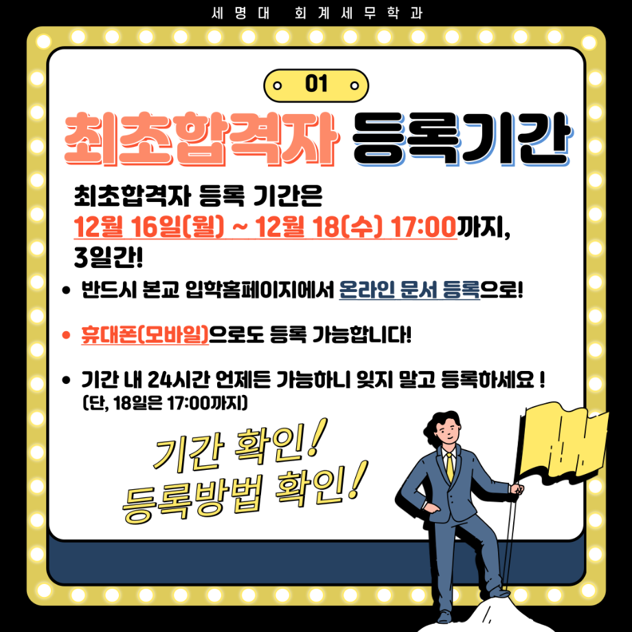 본문 시작 홈으로 학과소식 학과소개 취업정보 교육과정 학과소식 홈페이지가이드 포토갤러리 공지사항 포토갤러리 학과이야기 학과행사 포토갤러리 페이스북 트위터 프린트 2025학년도 수시모집 최초합격자 등록 안내 회계세무학과 1669 2024-12-16 2025 학년도 수시모집 최초합격자 등록 안내사항입니다. 목록 이전12월 학사일정 다음 [알쓸신잡_2025년 01월 3주차] ●취업 및 일자리 정보 제공 안내문● 담당부서 : 회계세무학과 담당자 : - 연락처 : 043-649-1244 최종수정일 : 2024-10-26 만족도조사 만족도 조사 이 페이지에서 제공하는 정보에 대하여 만족하시나요? 매우만족 만족 보통 불만족 매우불만족