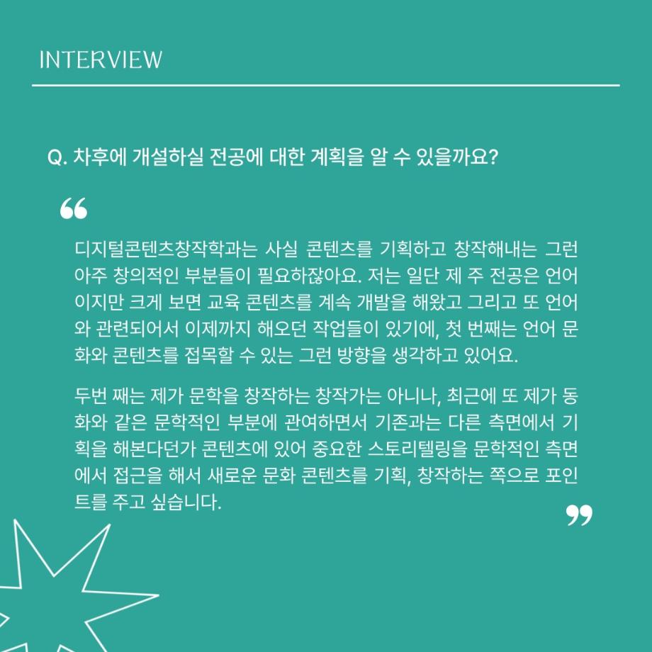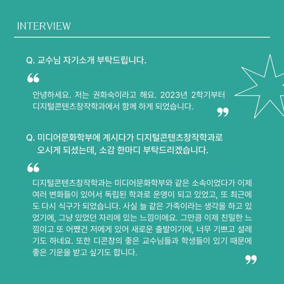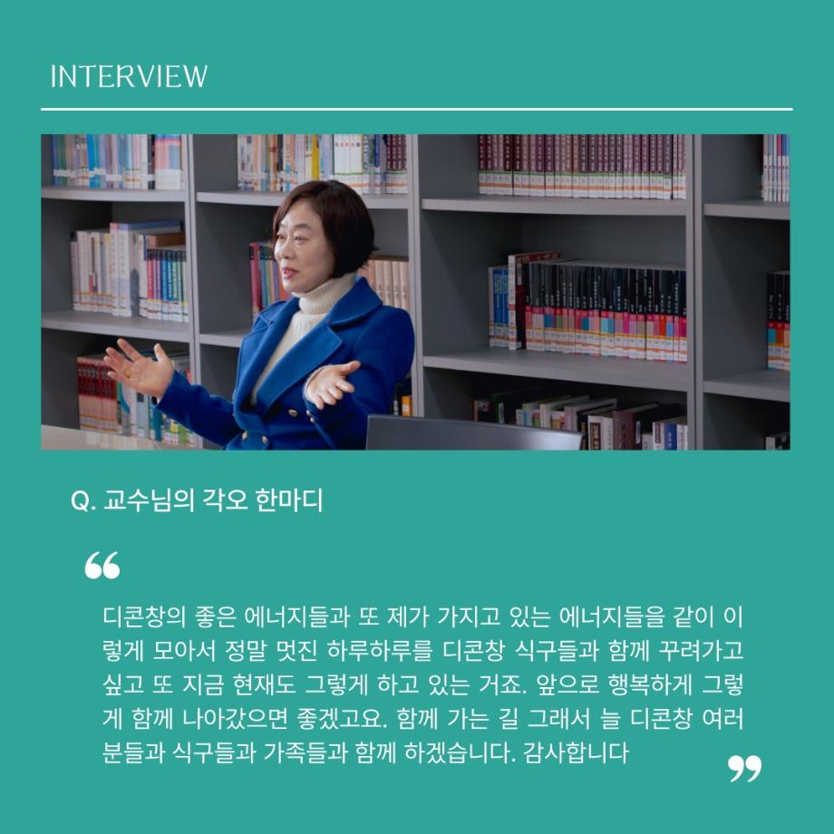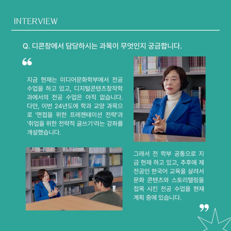 본문 시작 홈으로 MCC News 학과소개 교수소개 학과과정 MCC News MCC SNS 홈페이지가이드 교수 및 졸업생 학과 및 재학생 교수 및 졸업생 미디어 정보통 교수 및 졸업생 페이스북 트위터 프린트 디지털콘텐츠창작학과 권화숙 교수님 인터뷰 📸 디지털콘텐츠창작학과 2612 2024-04-17 작년 2023년 2학기부터 디지털콘텐츠창작학과로 오시게 된 권화숙 교수님을 모시고 인터뷰를 진행하였습니다! 권교수님의 각오와 향후 계획에 대한 이야기를 함께 들어봐요 😚 목록 이전세명대 김기태 교수와 디자인인포 박재원 대표, 9년째 장학금 기탁 다음 디지털콘텐츠창작학과 김기태 교수님 인터뷰 📸 담당부서 : 미디어콘텐츠창작학과 담당자 : - 연락처 : 043-649-1741 최종수정일 : 2024-10-26 만족도조사 만족도 조사 이 페이지에서 제공하는 정보에 대하여 만족하시나요? 매우만족 만족 보통 불만족 매우불만족