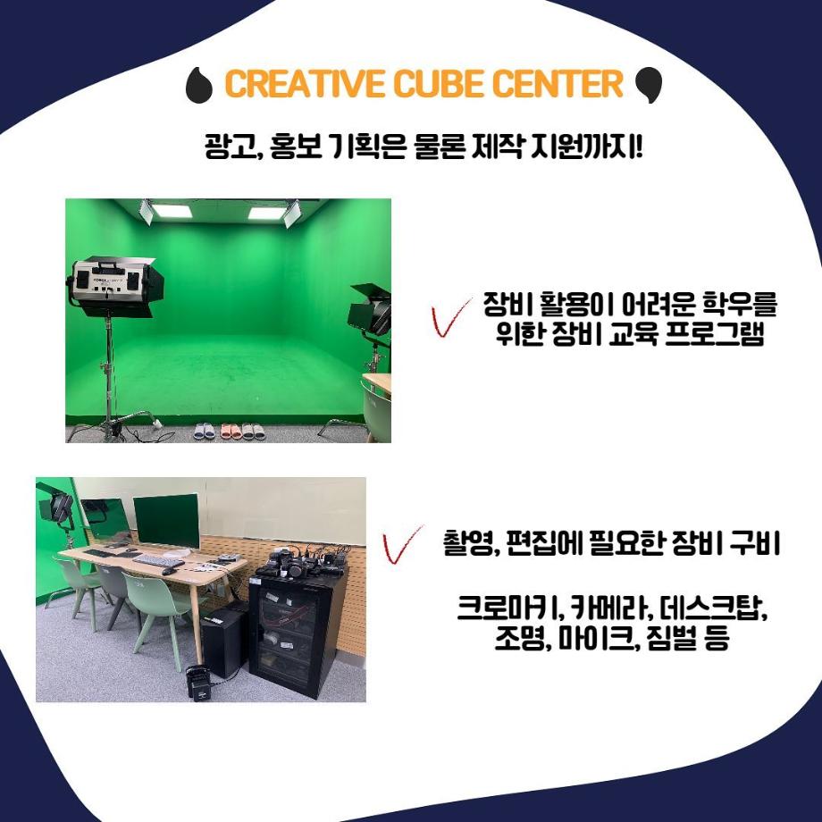 본문 시작 홈으로 특별CC프로그램 매력적인 학과소개 흥미로운 교육과정 특별CC프로그램 We can 취업 따뜻한 커뮤니티 홈페이지가이드 광고영상 제작실습 광고영상 제작실습 광고디자인 자격증취득 C&E(도전!경험!) 광고영상 제작실습 페이스북 트위터 프린트 크리에이티브 스튜디오2 광고홍보학과 2504 2022-08-30 크로마키 스튜디오, 맥컴퓨터, 소니 카메라/캠코더 등 마음껏 광고영상 만들어 보세요 : ) 목록 이전광고홍보학과실습실_크리에이티브 스튜디오 다음 광고영상제작편집프로그램
