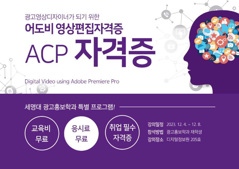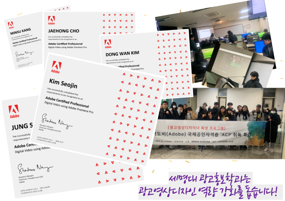 본문 시작 홈으로 특별CC프로그램 매력적인 학과소개 흥미로운 교육과정 특별CC프로그램 We can 취업 따뜻한 커뮤니티 홈페이지가이드 광고디자인 자격증취득 광고영상 제작실습 광고디자인 자격증취득 C&E(도전!경험!) 광고디자인 자격증취득 페이스북 트위터 프린트 [경축]광고영상제작편집 자격증 전원 취득 광고홍보학과 1914 2024-01-04 광고홍보학과에서 지원하는 광고영상디자인 역량 강화 프로그램 어도비( Adobe) 국제 공인 자격증 ACP 전원 취득을 축하합니다! 목록 이전Adobe Premier Pro 자격증 취득 다음 Adobe 포토샵 자격증 전원 합격