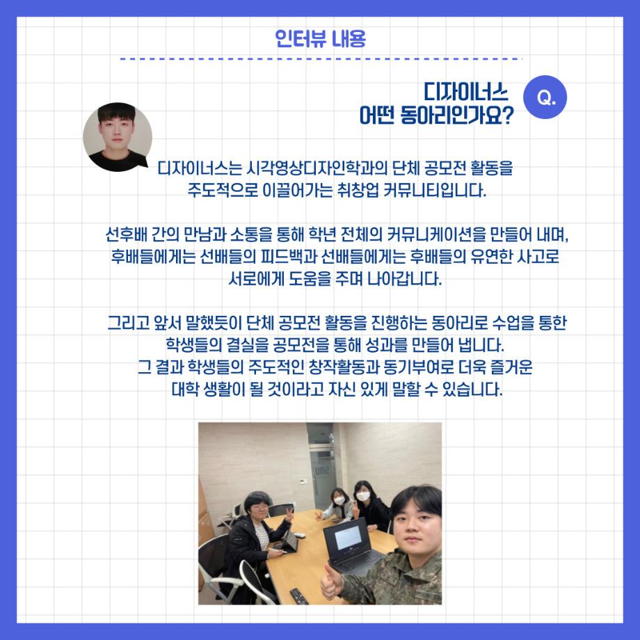 본문 시작 홈으로 학과자랑 학과소개 학과과정 시영소식 입학/취업 AI 학과자랑 SNS소통 홈페이지가이드 공모전 동아리 학과자랑 갤러리 공모전 동아리 졸업전시회 DesingN_us 외 DesingN_us 외 DesingN_us 외 페이스북 트위터 프린트 시각영상디자인학과 동아리 소개_디자이너스 시각영상디자인학과 2718 2023-05-15 목록 이전시각영상디자인학과 동아리 소개_스터디자인 다음 시영 동아리 활동 사진 담당부서 : 시각영상디자인학과 담당자 : - 연락처 : 043-649-1726 최종수정일 : 2024-10-26 만족도조사 만족도 조사 이 페이지에서 제공하는 정보에 대하여 만족하시나요? 매우만족 만족 보통 불만족 매우불만족