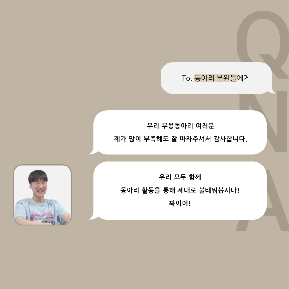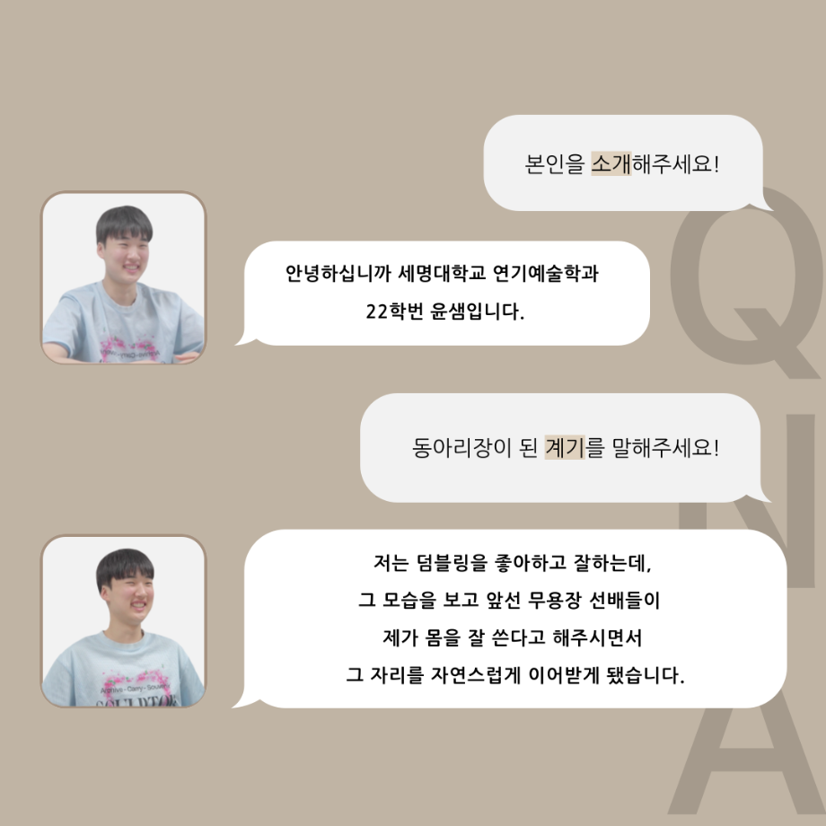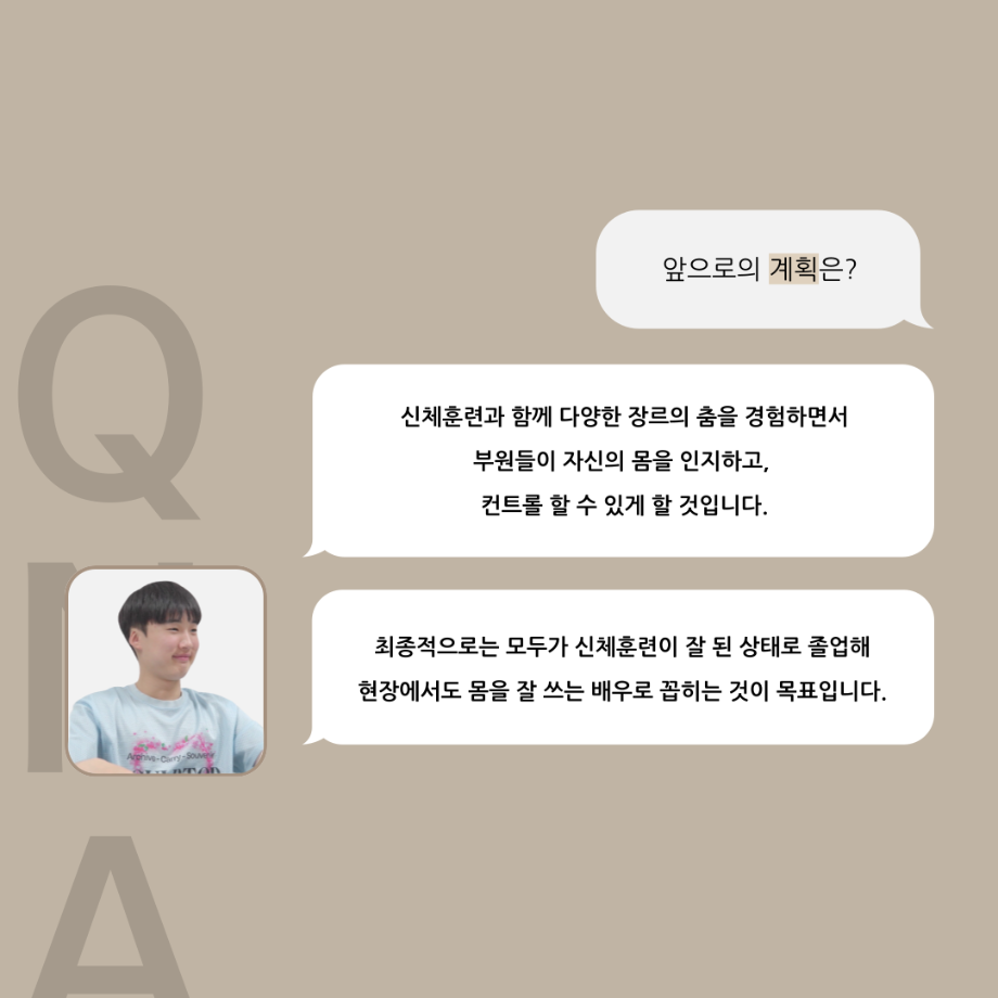 본문 시작 홈으로 커뮤니티 학과소개 입학정보 교수소개 학과과정 커뮤니티 공연예매 안내 홈페이지가이드 동아리 공지사항 포토갤러리 작품DB 동아리 학사일정 학생회 무용 동아리 무용 동아리 뮤지컬 동아리 극장 스탭 동아리 배우 훈련 동아리 무용 동아리 페이스북 트위터 프린트 '품'위있는 인'터뷰' - 24년도 무용동아리장 <윤샘> 연기예술학과 3479 2024-07-29 안녕하십니까. 24년도 학회 ‘품‘ 입니다. 학회 ‘품’의 일곱 번째 인터뷰로 세명대학교 연기예술학과 24학년도 무용동아리장인 윤샘 학우와 인터뷰 하는 시간을 가졌습니다. 무용 동아리장이 된 계기와 동아리에서는 어떤 활동을 하고있는지, 앞으로의 계획은 무엇으며 동아리 부원들에게 전하고 싶은 말 등을 질문하는 시간을 가졌습니다. 앞으로 있을 인터뷰 컨텐츠인 ‘품터뷰’ 많은 사랑 부탁드립니다. 목록 이전2024년도 1학기 무용동아리 - 화란 활동! 다음 2025년도 1학기 무용동아리 화란 만족도조사 만족도 조사 이 페이지에서 제공하는 정보에 대하여 만족하시나요? 매우만족 만족 보통 불만족 매우불만족