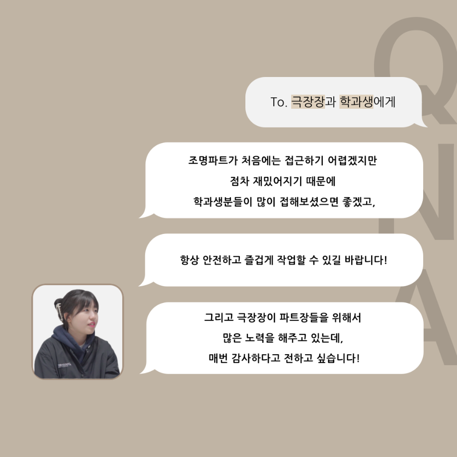 본문 시작 홈으로 커뮤니티 학과소개 입학정보 교수소개 학과과정 커뮤니티 공연예매 안내 홈페이지가이드 동아리 공지사항 포토갤러리 작품DB 동아리 학사일정 학생회 극장 스탭 동아리 무용 동아리 뮤지컬 동아리 극장 스탭 동아리 배우 훈련 동아리 극장 스탭 동아리 페이스북 트위터 프린트 ’품‘위있는 인’터뷰‘ - 24년도 조명장 <오승아> 연기예술학과 2419 2024-07-22 안녕하십니까. 24년도 학회 ‘품‘ 입니다. 학회 ‘품’의 다섯 번째 인터뷰로 세명대학교 연기예술학과 24학년도 조명장인 오승아 학우와 인터뷰 하는 시간을 가졌습니다. 조명장을 맡게된 소감과 조명은 어떤 의미가 있는지, 조명에서 조심히 해야하는 것은 무엇이며 극장장과 학과생에게 전하고 싶은 말 등을 질문하는 시간을 가졌습니다. 앞으로 있을 인터뷰 컨텐츠인 ‘품터뷰’ 많은 사랑 부탁드립니다. 목록 이전’품‘위있는 인’터뷰‘ - 24년도 무대장 <장보배> 다음 ’품‘위있는 인’터뷰‘ - 24년도 음향장 <임소정> 만족도조사 만족도 조사 이 페이지에서 제공하는 정보에 대하여 만족하시나요? 매우만족 만족 보통 불만족 매우불만족