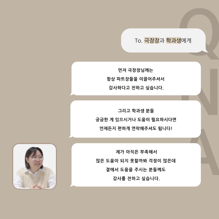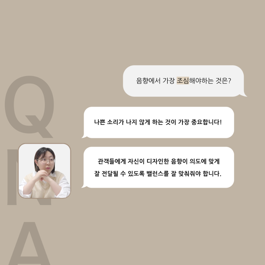 본문 시작 홈으로 커뮤니티 학과소개 입학정보 교수소개 학과과정 커뮤니티 공연예매 안내 홈페이지가이드 동아리 공지사항 포토갤러리 작품DB 동아리 학사일정 학생회 극장 스탭 동아리 무용 동아리 뮤지컬 동아리 극장 스탭 동아리 배우 훈련 동아리 극장 스탭 동아리 페이스북 트위터 프린트 ’품‘위있는 인’터뷰‘ - 24년도 음향장 <임소정> 연기예술학과 2459 2024-07-24 안녕하십니까. 24년도 학회 ‘품‘ 입니다. 학회 ‘품’의 여섯 번째 인터뷰로 세명대학교 연기예술학과 24학년도 음향장인 임소정 학우와 인터뷰 하는 시간을 가졌습니다. 음향장을 맡게된 소감과 음향은 어떤 의미가 있는지, 음향에서 조심히 해야하는 것은 무엇이며 극장장과 학과생에게 전하고 싶은 말 등을 질문하는 시간을 가졌습니다. 앞으로 있을 인터뷰 컨텐츠인 ‘품터뷰’ 많은 사랑 부탁드립니다. 목록 이전’품‘위있는 인’터뷰‘ - 24년도 조명장 <오승아> 다음 세명대학교 연기예술학과 극장동아리 ‘짜스트’ 만족도조사 만족도 조사 이 페이지에서 제공하는 정보에 대하여 만족하시나요? 매우만족 만족 보통 불만족 매우불만족
