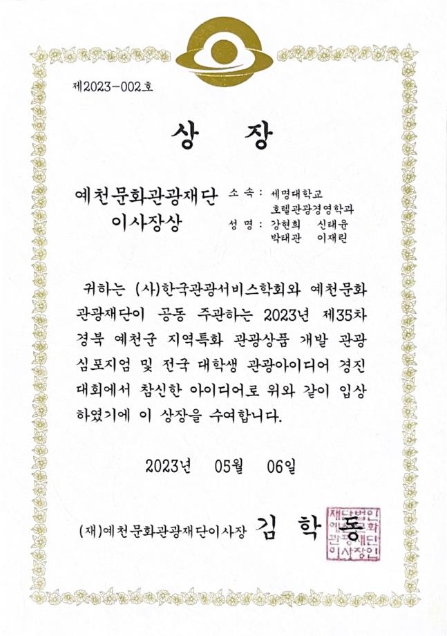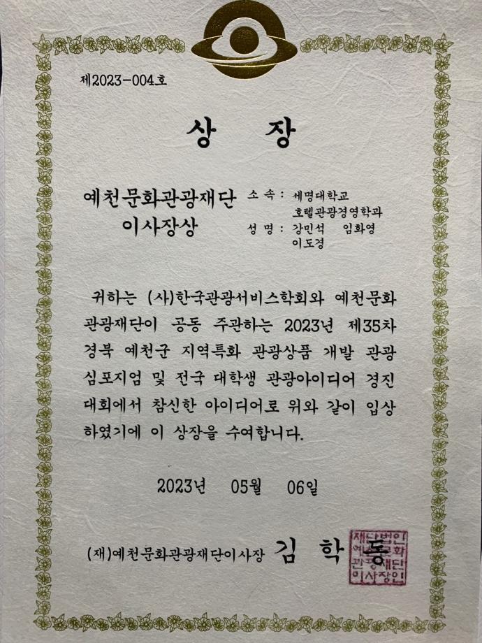 본문 시작 홈으로 커뮤니티 커뮤니티 학과소개 교육 홈페이지가이드 학과동아리 공지사항 학생회활동 학과동아리 취업정보 Idea Bank Idea Bank SOW 빵실빵실 쉐이커스 Idea Bank 페이스북 트위터 프린트 2023년 1학기 공모전 수상 호텔경영학과 2454 2023-05-15 2023년 1학기 공모전 수상 목록 이전2023년 1학기 동아리 활동사진 다음 2023년 2학기 동아리 활동 1 만족도조사 만족도 조사 이 페이지에서 제공하는 정보에 대하여 만족하시나요? 매우만족 만족 보통 불만족 매우불만족