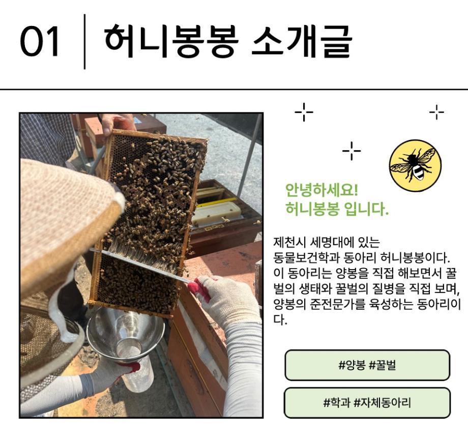 허니봉봉은 꿀벌을 직접 관찰하고 관리하며 양봉을 배우는 특별한 동아리예요. 단순히 꿀만 얻는 것이 아니라 꿀벌의 생태, 질병, 계절별 관리 방법까지 직접 체험하고 배우면서 양봉 전문가로 성장할 수 있는 기회를 제공합니다.