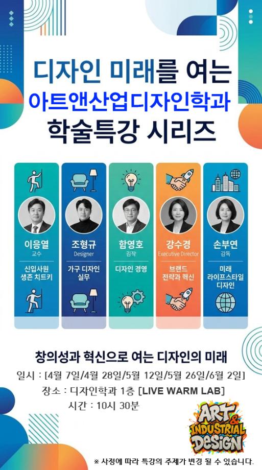 본문 시작 홈으로 학과생활 학과소개 교수소개 교과과정 학과생활 홈페이지가이드 학과행사 공지사항 사진게시판 전공자료실 동아리 학과행사 학과행사 페이스북 트위터 프린트 [학술특강] 2026학년도 1학기 학술특강 계획 아트앤산업디자인학과 35 2026-04-22 목록 이전[특강] 산업디자인 실무체험 학술특강 [가구디자인실무 &취업가이드] 만족도조사 만족도 조사 이 페이지에서 제공하는 정보에 대하여 만족하시나요? 매우만족 만족 보통 불만족 매우불만족