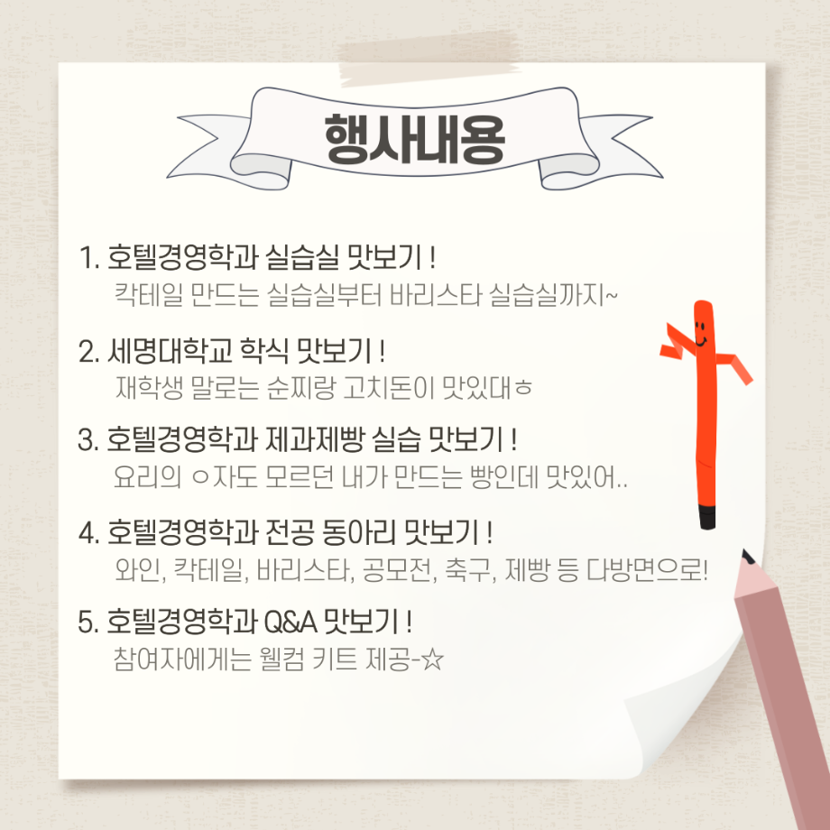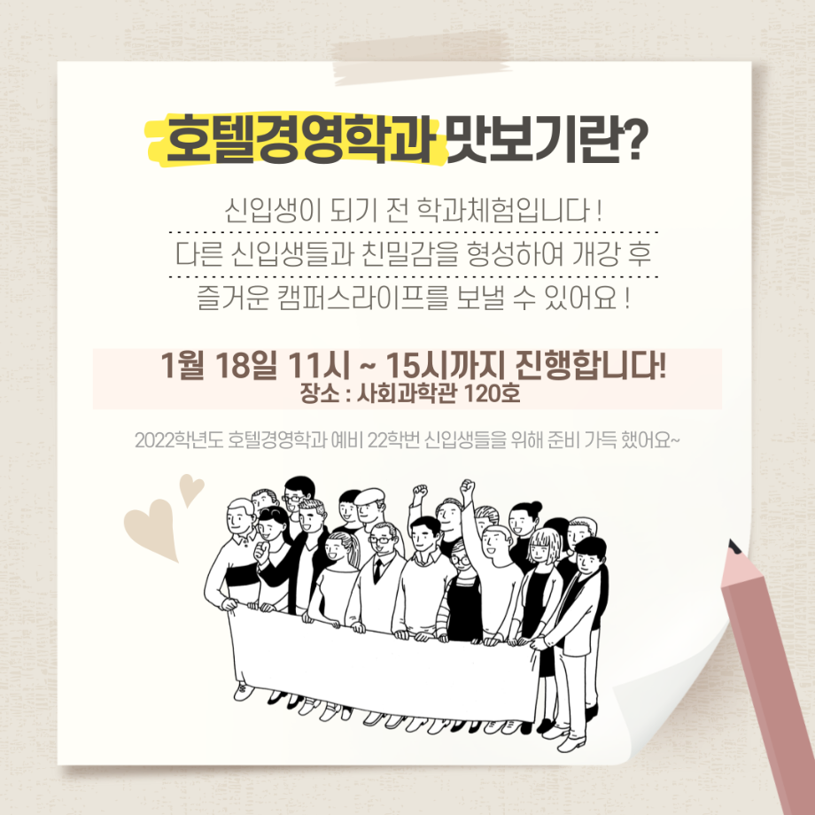 본문 시작 홈으로 학과소개 커뮤니티 학과소개 교육 홈페이지가이드 학과행사 학과장인사말 교수소개 학과행사 학과행사 페이스북 트위터 프린트 2022년 호텔경영학과 지원 수험생 대상 맛보기 행사 호텔경영학과 2008 2022-01-18 2022학년도 호텔경영학과 맛보기 행사 1. 행사 일정 : 2022년 1월 18일(화)_사회과학관 120호 2. 행사 시간 : 오전 11시 ~ 오후 3시 3. 행사 대상 : 2022학년도 호텔경영학과 예비 22학번 4. 행사 내용 - 호텔경영학과 실습실 맛보기 ! - 세명대학교 학식 맛보기 ! - 호텔경영학과 제과제빵 실습 맛보기 ! - 호텔경영학과 전공 동아리 맛보기 ! - 호텔경영학과 Q&A 맛보기 ! * 참여자에게 웰컴키트 제공 ! 목록 다음 2021년 재학생 행사 만족도조사 만족도 조사 이 페이지에서 제공하는 정보에 대하여 만족하시나요? 매우만족 만족 보통 불만족 매우불만족
