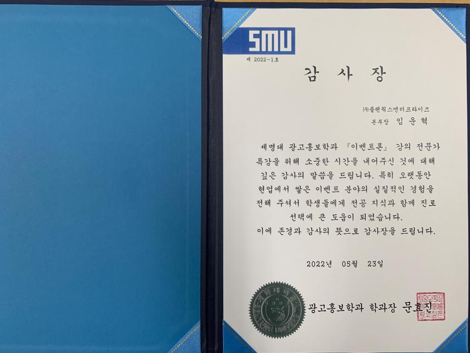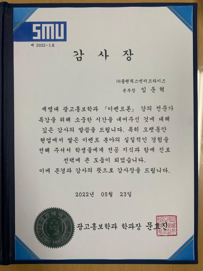 본문 시작 홈으로 매력적인 학과소개 매력적인 학과소개 흥미로운 교육과정 특별CC프로그램 We can 취업 따뜻한 커뮤니티 홈페이지가이드 지금 우리 광홍은 학과개요 학과연혁 교수소개 Wilco로 보는광고홍보학과 지금 우리 광홍은 지금 우리 광홍은 페이스북 트위터 프린트 [이벤트 제작 수업 플랜웍스엔터 임운혁 본부장님 특강] 광고홍보학과 2516 2022-05-23 5월 23일(월), 이벤트 제작 수업에 플랜웍스엔터 임운혁 본부장님의 특강이 진행되었습니다! 오랫동안 현업에서 쌓은 이벤트 실무능력과 전공 지식을 기반으로 이벤트 업계의 현황, 제안서 작성법 등을 광고홍보학과 학생들에게 가르쳐주셨습니다. 이에 존경과 감사의 뜻으로 감사패를 만들어 전달하였습니다. 학생들에게 전공 지식습득과 진로 선택에 도움이 되어주신 임운혁 본부장님께 감사인사 드립니다👍👏 목록 이전[🎊2022 광고홍보학과 광광체전🎊] 다음 [ 2022 사회과학대학 학부(과) 홍보 UCC / Short Form 공모전 수상🏆]