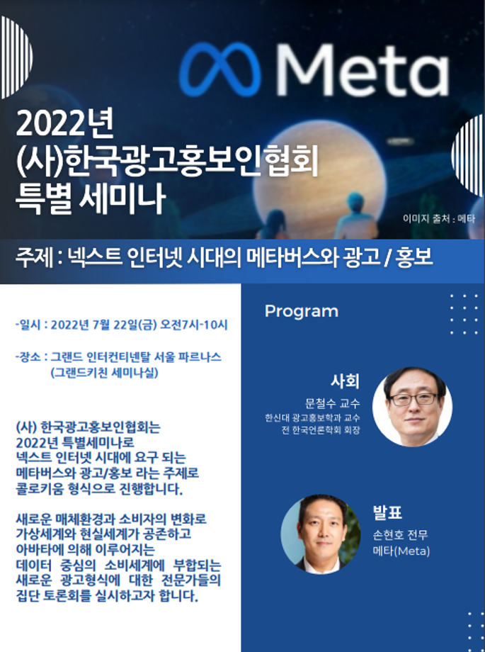 본문 시작 홈으로 매력적인 학과소개 매력적인 학과소개 흥미로운 교육과정 특별CC프로그램 We can 취업 따뜻한 커뮤니티 홈페이지가이드 지금 우리 광홍은 학과개요 학과연혁 교수소개 Wilco로 보는광고홍보학과 지금 우리 광홍은 지금 우리 광홍은 페이스북 트위터 프린트 특별 세미나_넥스트 인터넷 시대의 메타버스와광고/홍보 광고홍보학과 4482 2022-09-16 우리 광홍과 교수님들은 열공중! 특별 세미나 참석. - 주최 : (사) 한국광고홍보인협회 - 주제 : 넥스트 인터넷 시대의 메타버스와 광고/홍보 - 발표 : 손현호 전무님(Meta). Meta는 Facebook의 변경된 사명임 - 참석 : 서범석 교수님(주최자), 정연우 교수님(토론자), 문효진 교수님(토론자) * 행사를 주최한 (사)한국광고홍보인협회 회장님은 우리 광홍과 서범석 교수님이십니다. ^^ 목록 이전2022년도 광고홍보 취업 특강 시리즈 1탄 다음 대한민국 대학생 광고대회 대전/충청권 1위