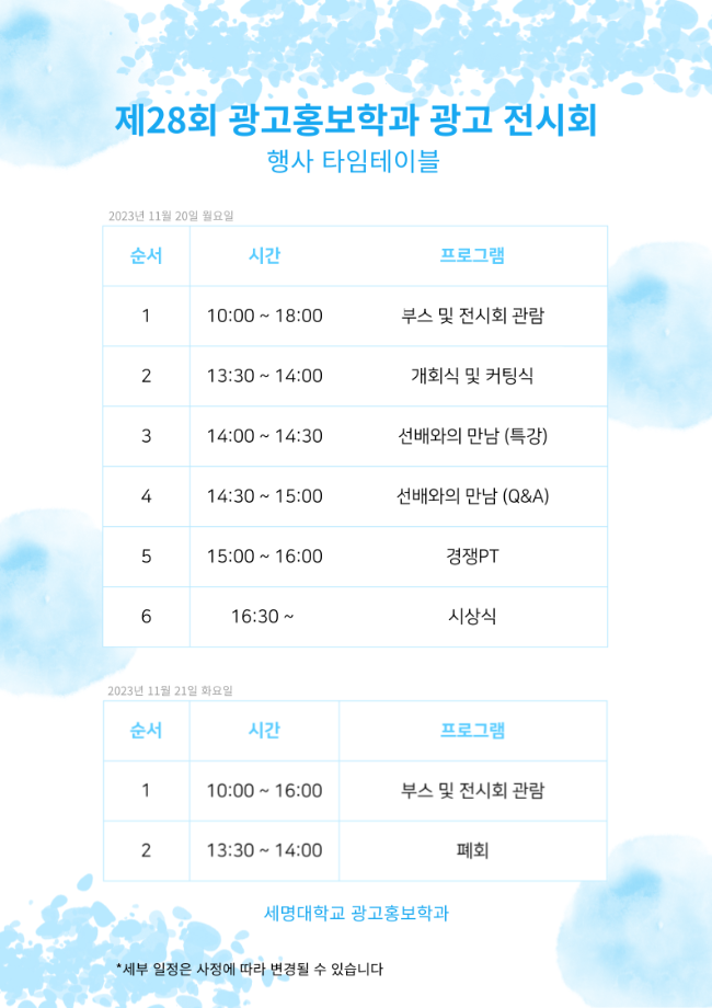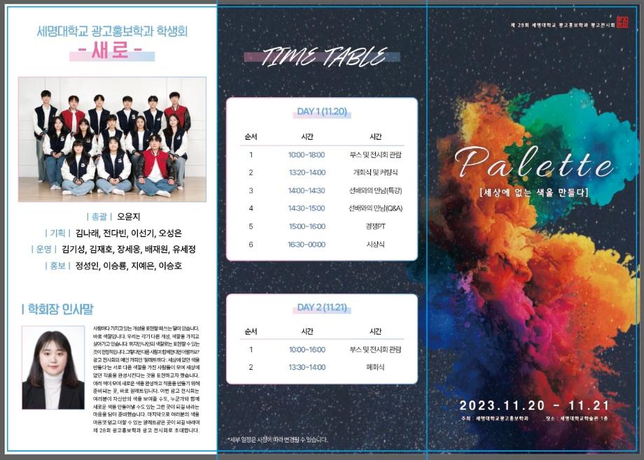 본문 시작 홈으로 매력적인 학과소개 매력적인 학과소개 흥미로운 교육과정 특별CC프로그램 We can 취업 따뜻한 커뮤니티 홈페이지가이드 지금 우리 광홍은 학과개요 학과연혁 교수소개 Wilco로 보는광고홍보학과 지금 우리 광홍은 지금 우리 광홍은 페이스북 트위터 프린트 [전시회]제28회 광고전시회 개최 광고홍보학과 3346 2023-11-15 28년째를 맞이하는 광고홍보학과의 시그니처 프로그램 '광고전시회'가 개최됩니다. _일시 : 2023년 11월 20일 ~ 21일, 2일간 _장소 : 세명대학교 학술관 1층 일대 _주제 : 팔레트 : 세상에 없는 색을 만들다 _프로그램 : 경쟁PT, 공모전 작품, 산학협력 프로그램 작품, 이벤트, 포토존 등 많은 참여 바랍니다. 목록 이전[애드아시아]국제광고행사참가 다음 [학과홍보]지금 우리 광홍은!