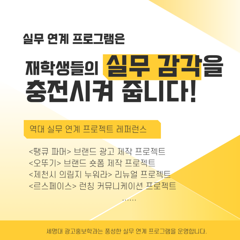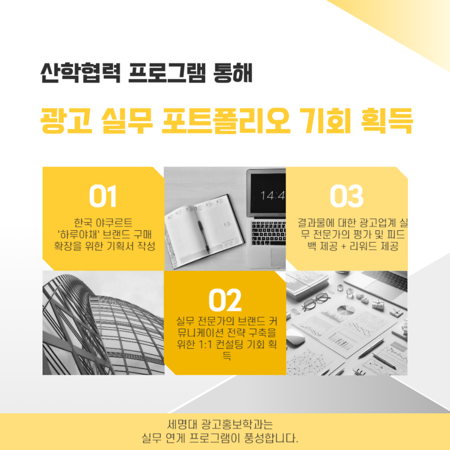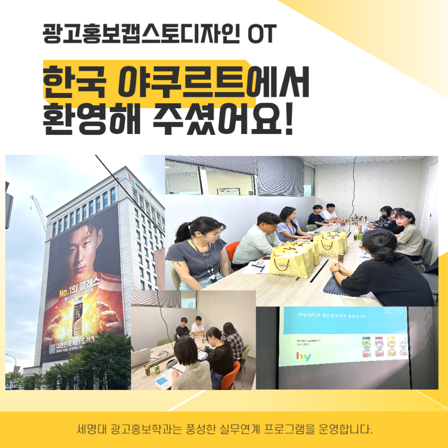 본문 시작 홈으로 매력적인 학과소개 매력적인 학과소개 흥미로운 교육과정 특별CC프로그램 We can 취업 따뜻한 커뮤니티 홈페이지가이드 지금 우리 광홍은 학과개요 학과연혁 교수소개 Wilco로 보는광고홍보학과 지금 우리 광홍은 지금 우리 광홍은 페이스북 트위터 프린트 [광고홍보캡스톤디자인]한국야쿠르트 <하루야채> 브랜드 광고홍보학과 3420 2024-09-10 2024년도 2학기 광고홍보캡스톤디자인 수업 _주 제 : 한국야쿠르트 <하루야채> 브랜드 구매 확장 전략 _담당교수 : 김신엽 교수님 _일 정 : 2024년도 2학기 성공적인 결과물을 기대합니다. : ) 세명대 광고홍보학과는 기획 맛집을 지향합니다~. 목록 이전[공동교육과정]단양/제천 소재 고교생 대상 광고/마케팅 특강 다음 [수상]2024코삭챌린저상